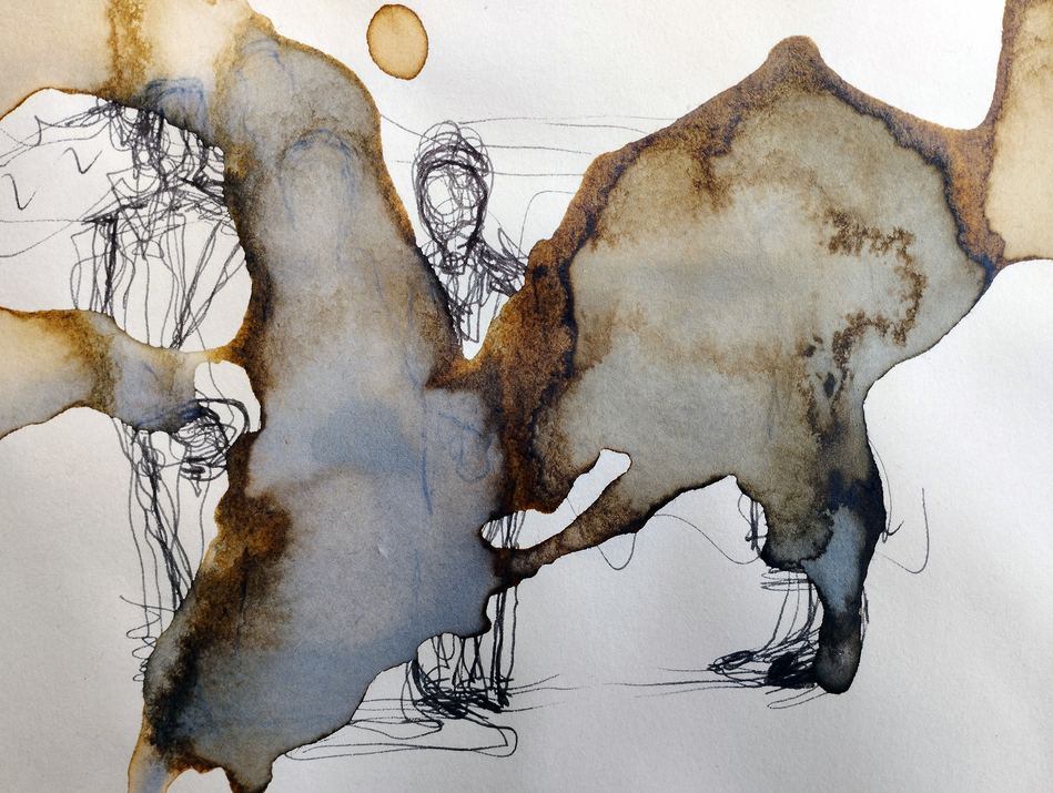 This person was mutant, not of the DNA that had passed to M. through his generations, but regarding her image brought to the medium, the ink, acrylic, and the coffee-staining that especially, affected the cardboard's structure. She was not part of the family, and therefore did not convey the phenotype, even though the latter expresses itself in myriad ways that look much the same as many other people comparisons. As a mutant, the erstwhile landlady was only other to M., but also to the project so far, acting as a midway between the before and prospective after of the project. Would that M. could slide off this occasional carer's lap and onto the way forward, growing as he went; which is exactly what happens. The only proviso to this movement is that M. is conducting it as a kind of future anterior, as of mature adult age pulling forward his past into the present, the eternally present of the project for as long as it is in its state of becoming.