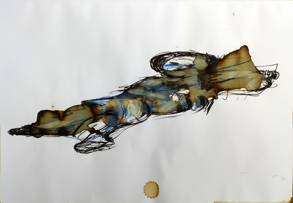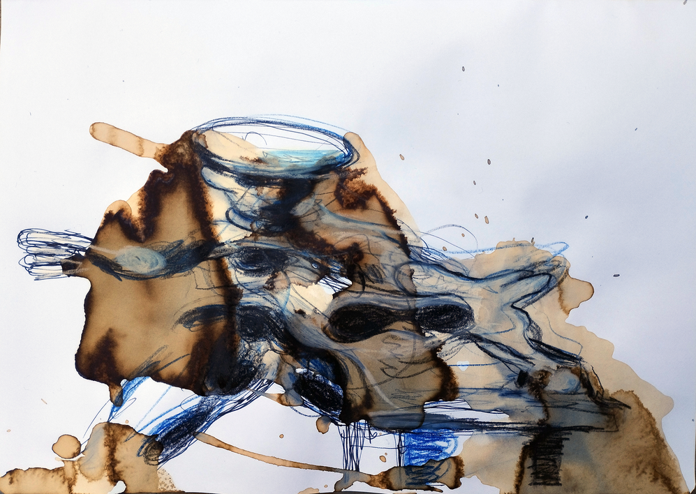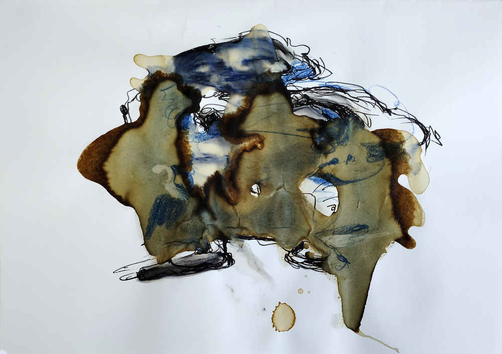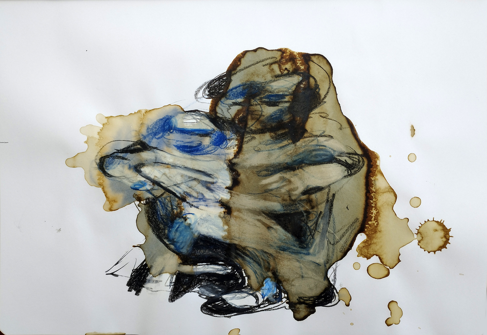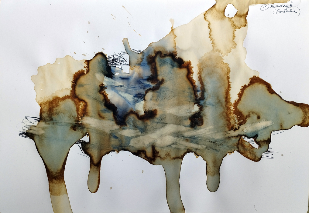 The degradation of the photographs by coffee had triggered M.'s creative imagination, and while he was loathe to destroy his precious evidence of his surrogate family, he realised that by accepting his own extreme limitations towards sketched versimilitude he could explore the coffee metaphor as a medium of erasing precise human circumstances in order to spread, literally, the dissemination of human movement in global terms. Coffee, as it impregnated the page, both mapped its own movement and resembled the earth's terrain, Figure 2a, below.