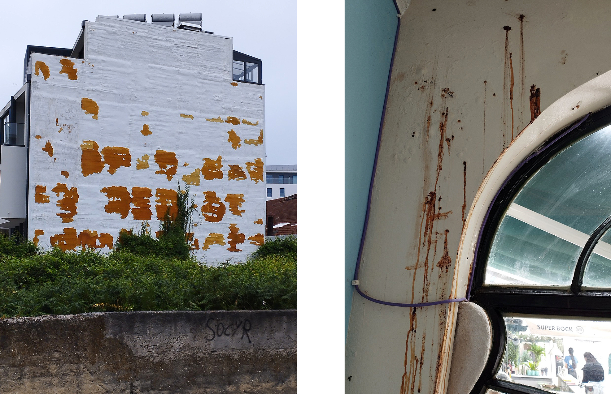 Figs 25/26: Photos of corrosion respectively revealed and seaping through painted surface, Aveiro, dimensions variable © Michael Croft