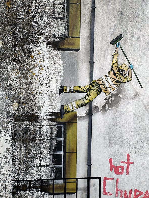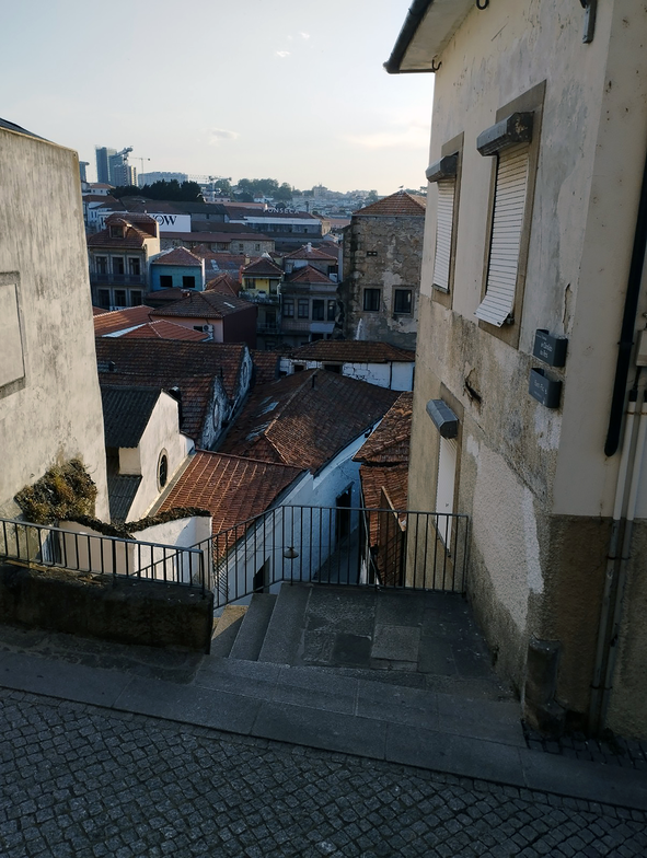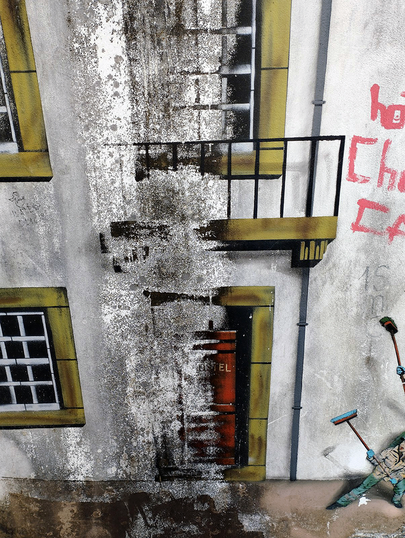 The two photos taken in Vila Nova de Gaia, south side of the Duro River that divides Gaia from Porto, Figures 4 and 5 (left and centre), are painted frescoes on a wall below the steps shown in the photo Figure 6 (right side). Figure 6 is also an example of the kind of urban architecture that the fresoes strive to represent. What's primarily interesting, however, about the fresco details, is how the realistically portrayed human figure in the centre photo – of which there were several other instances – is both emerging from the decay of the fresco and is clearly also separate. Even more exemplary of this tendency is that of the door, windows and balconies. Heightened by the presence of newer applied graffiti, one is inclined to interpret the figures as wall cleaners, and the subsequent corrosion of the actual fresco as an indication of what would as likely happen if actual cleaners were now tasked with its removal. History remains, but oscillating ambiguously between its evidence's removal and recovery.