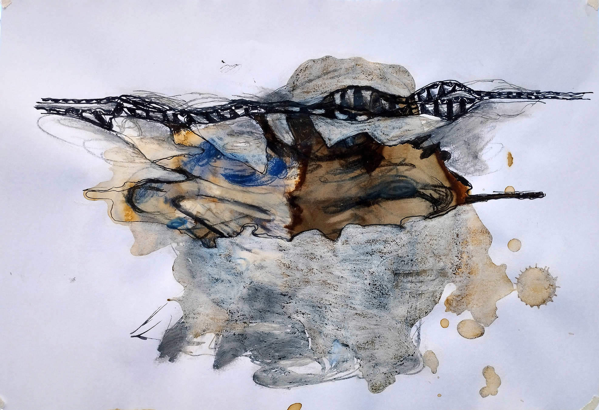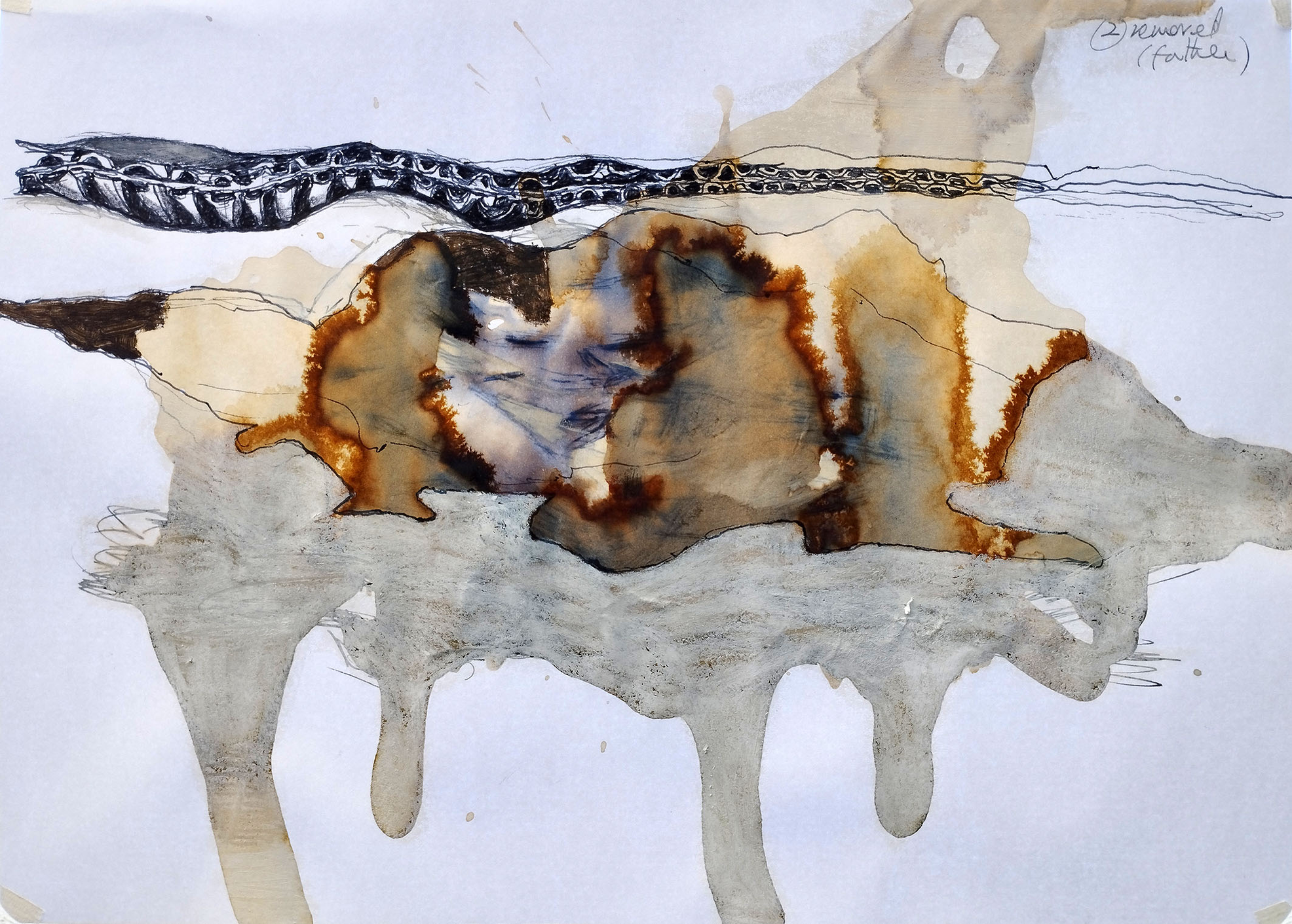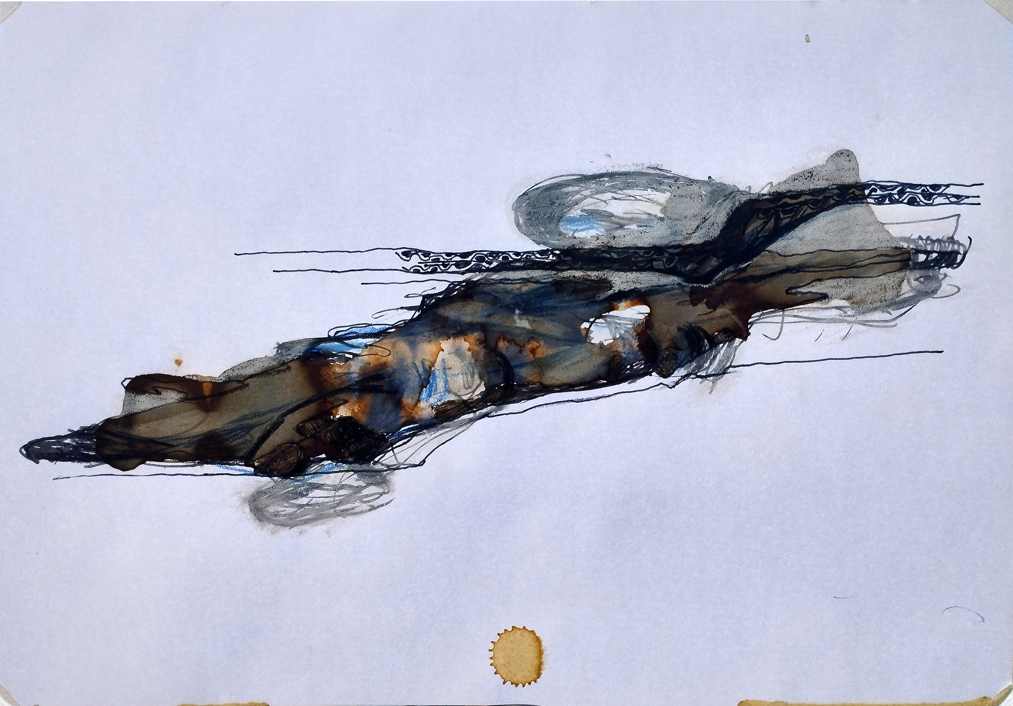 Fig 36: Mother image, Figure 34, observed from the top narrow dimension of its corrugated cardboard support and drawn onto the sketch, Figure 35, above, the latter image re-worked. Ink, crayon on paper and acrylic paint on paper, 29.5 x 21cm, attributed to M.