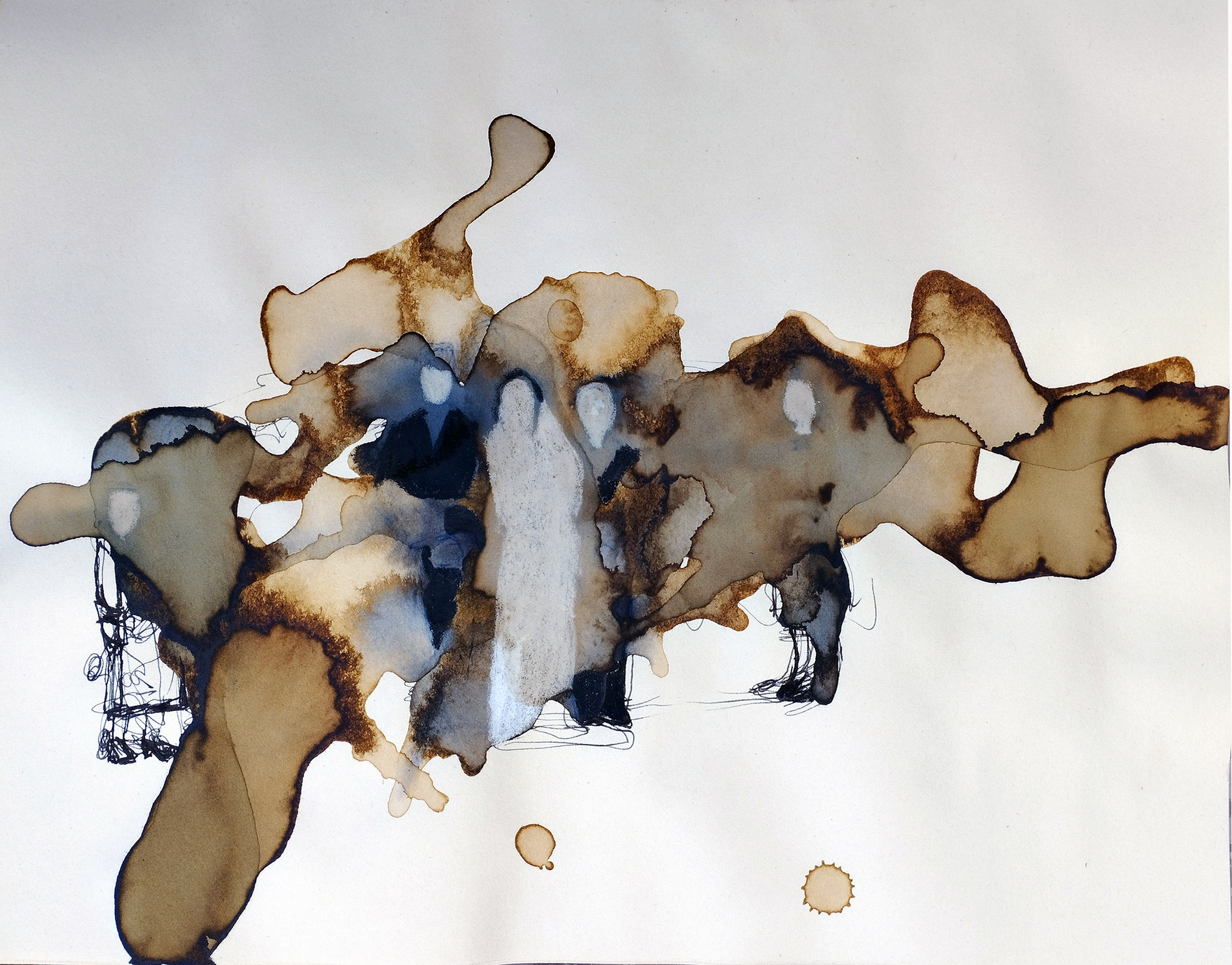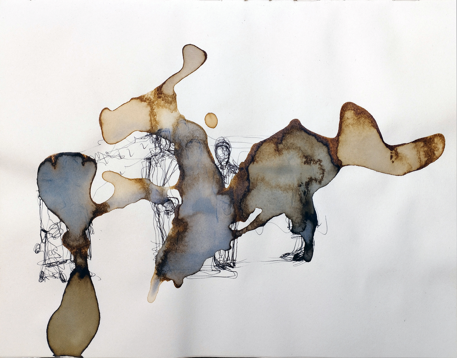 In its wake, the coffee left traces of the representations in ink, of what it had by its own automatic volition lifted from M.'s efforts to roughly sketch human presence. The coffee pulled, distorted, bled and formed individual human presence in terms that could be considered analogous to the mapping of demography. Espresso gave him a slow release of contingent change, returning an anonymous extended family, the boxed set, as M. referred to it, to the closed lid of what had been their indefinite residence in the junk-shop, if not for their morphing into movement of phenomenal consequence. Contours within contours emerged that were layers in and of time. Newly-weds, their parents and grandparents either side of them, variously sacrificed themselves to suggesting their ancestral origin across time and space, albeit whatever imaginative reading can be superposed on what is in itself quite impoverished material, Figure 2b.