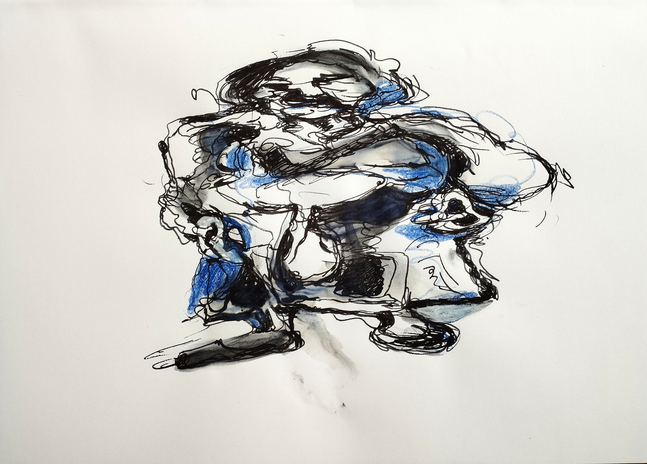 Fig 3: Sketch of family members, Figure 2a, reworked with white and black crayon. Ink, coffee, crayon on paper, 29.5cm x 21cm, attributed to M., 2023
