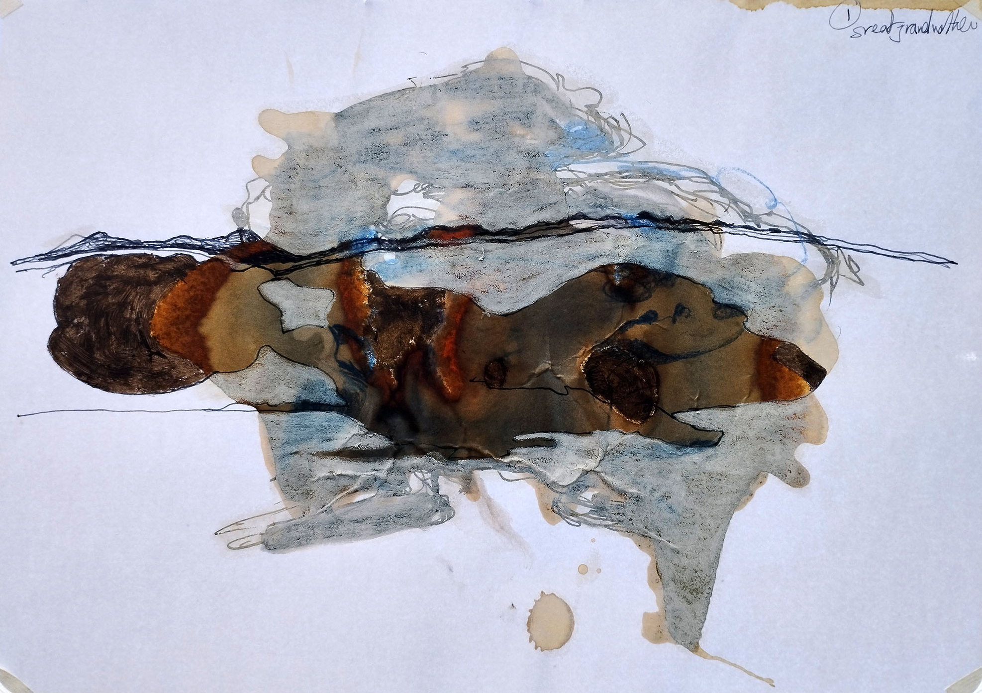 Fig 33: Grandfather image, Figure 29, observed from the top narrow dimension of its corrugated cardboard support and drawn onto the sketch, Figure 32, above, the latter image re-worked. Ink, crayon on paper and acrylic paint on paper, 29.5 x 21cm, attributed to M.