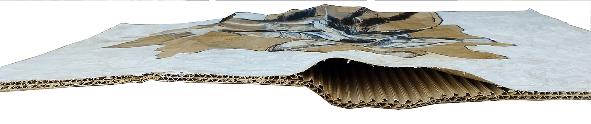 A second contingency has concerned my discovery, through certain reading, of the microbiome. According to Ball (2020, p.139), microbiome is the collective name for 'cells of organisms that exist symbiotically with us, living all over and within our flesh in an arrangement that is mostly of mutual benefit'. These can be, for example, good bacteria in the intestines, and mico-organisms on the skin, in the mouth, and variously around the body. Ball (2020, p.140-1) describes such micro-organisms as a 'collaborative community of non-human cells', which one inherits from one's mother but also from those continually around one during early infancy. Up until reading this I'd considered that the thread, as it were, running through the project would be mitochondria, my progress in understanding this aspect of one's genetic code charted by the analogy I draw to the material ground on which I've been working, namely corrugated cardboard, and specifically its corrugation. While the coffee staining – another key working material – seemed to relate to what I had also discovered regarding fungi, where the latter's tendency to permeate, spread, alter, and create zones, all of this mostly of its own volition in symbiotic interaction with whatever is its ground, is now equally if not more analogous to the function and behaviour of the microbiome.