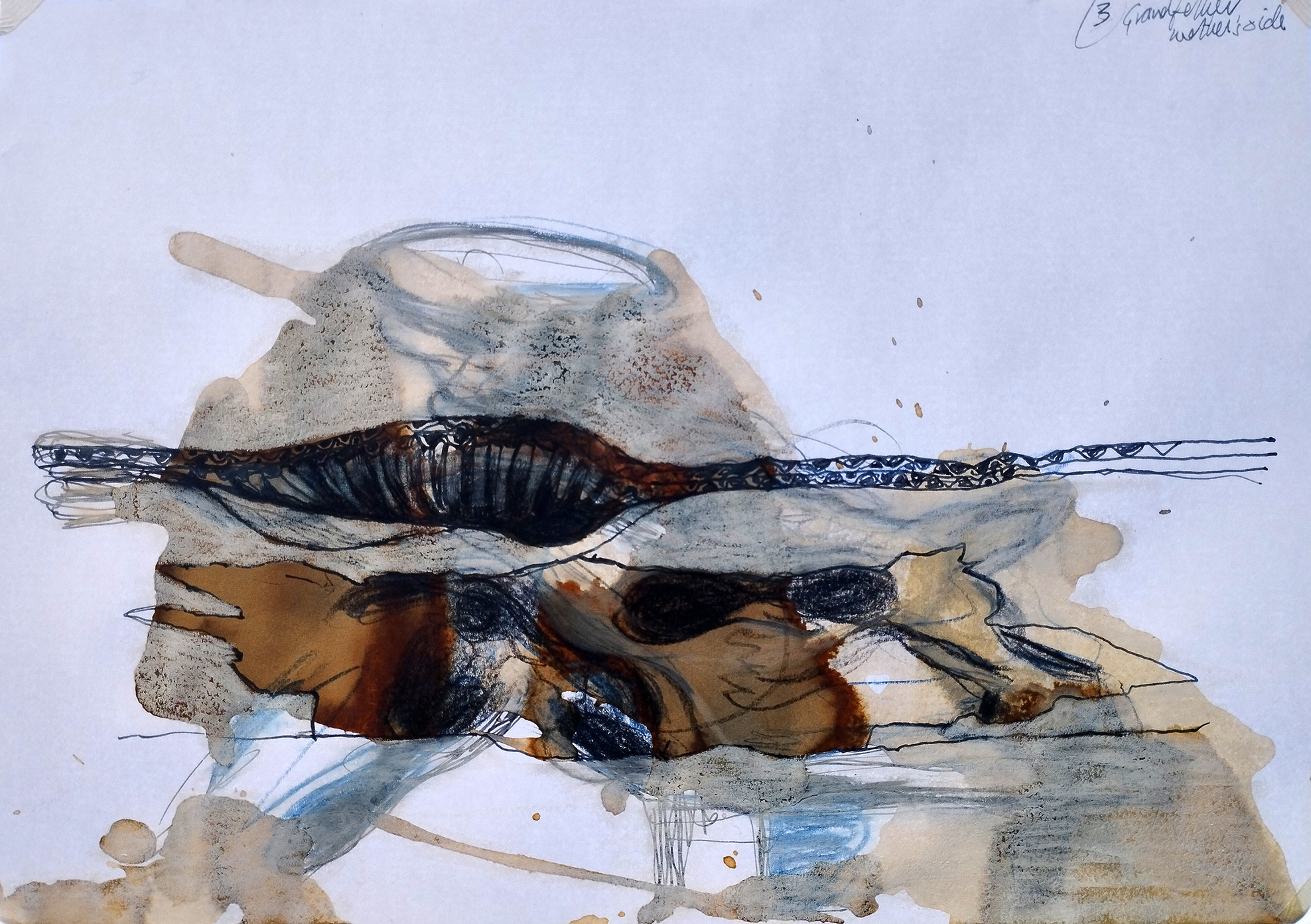 Fig 14: Great-grandmother image, Figure 9, observed from the top narrow dimension of its corrugated cardboard support and drawn onto the sketch image, Figure 13, the latter image re-worked. Ink, crayon on paper and acrylic paint on paper, 29.5 x 21cm, attributed to M.