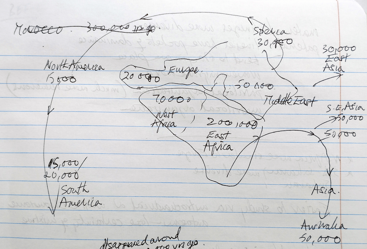 Fig 1: Hand-drawn map of movement of early humans from their earliest evidence in East Africa © Michael Croft 2023