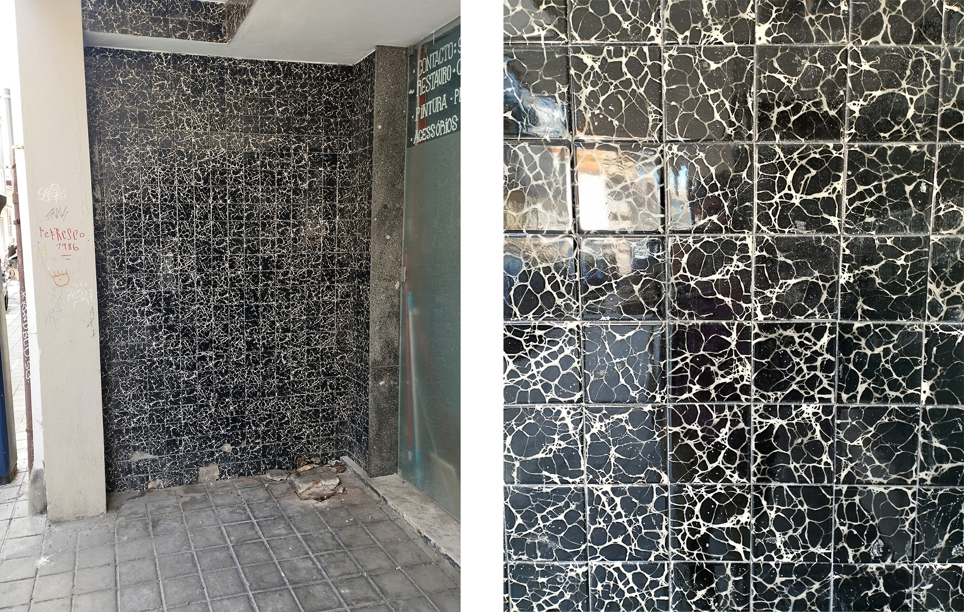 Fig 24: Photos of context and a detail of a marbled patterned tiled wall, Porto, Portugal, variable dimensions © Michael Croft