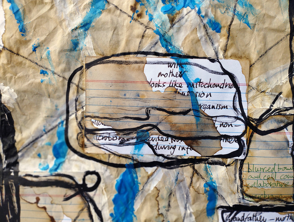 This is the third so-termed 'Closing notes', but is different inasmuch as it's also concluding comment, albeit of a project that is at the before stage of the project proper. The fact that I've been working with an idea of future findings of a DNA Ancestry test – 19th July, is the date of the workshop where the project's participants receive their results, my own included – without having very much idea of what to expect, has in a sense been quite liberating. The project has so far drifted, therefore, from a relatively obvious starting-point of family photos to a more conceptual idea of microbiological cells, of which their content is increasingly fragmented text that had beforehand transcribed speech. As the drawing process develops, the use of coffee-staining degrades the hand-written ink text and, analogously, mutates. I've adopted this process – like the character M.'s adoption of family photos in the project's fictional narrative in the project's Page 1 – over just two states of the drawing, yet this present Page 3 already shows the text as quite abstracted. Its layout, between details of the drawing's visual cells – as I'm proposing – and back to the figural images that the texts initially referenced, have both an elliptical sense and, if it's not too far stretching the point, a symbiotic sense. In Page 2 I reference Deleuze, who had cited the painter Francis Bacon, on spasm that occurs centrifugally; a kind of dynamic movement on the spot. Apart from what I think this reference suggests of how the visual-material work's content relates elliptically back on itself, there has been the experimentation with the Research Catalogue's template, especially where, when the reader clicks on 'Closing notes', they are taken back to below the opening introductory section of each of the pages. I'm hoping, however, that the drifting of content between creative writing, visualisation, academic writing, and oscillation between text and the idea of microbiological cells,is possible on the basis that not only is the content of the project at this stage relatively open-ended research, but that the ambiguities of the content are necessarily so, because I have as yet no clear idea of what the DNA Ancestry findings will tell me or how they will look.