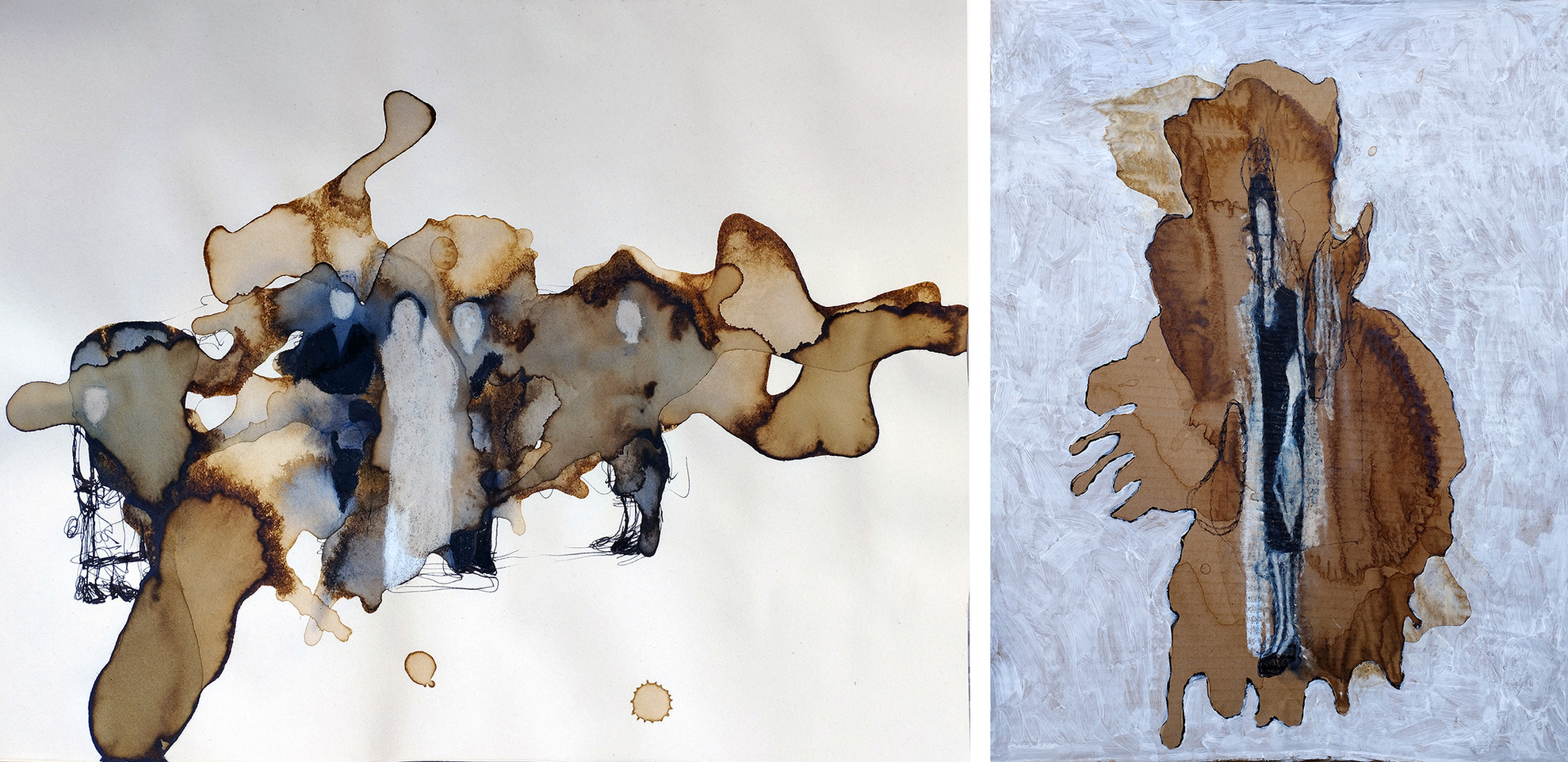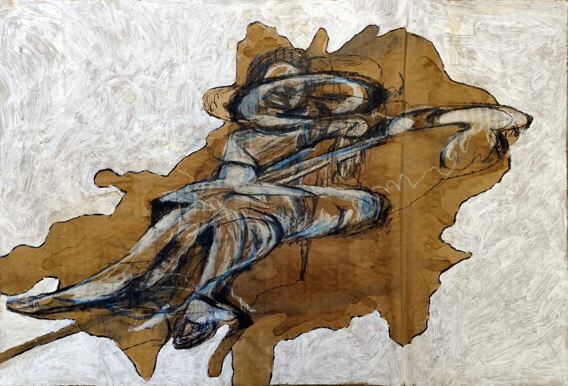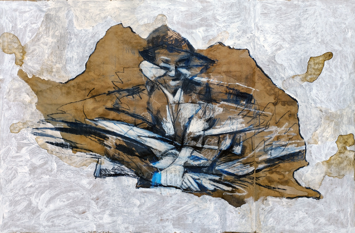 M.'s working from a photo of his adopted father was drawn and formed as a rocky promontory, suggested, paradoxically, by the liquid staining of coffee poured onto porous corrugated cardboard. Terrain had been an operative word.