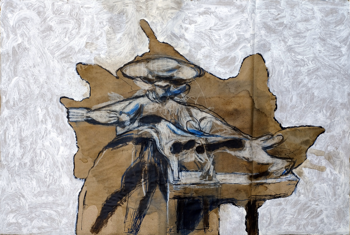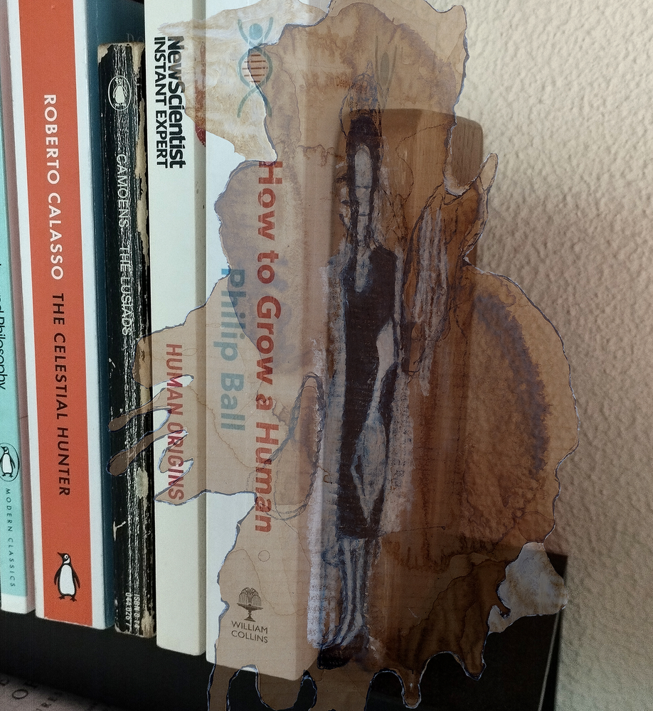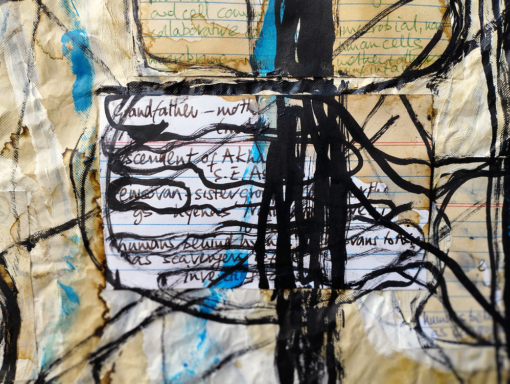 Ball (2020, p.199/200) also refers to 'chimeras' in the context of cells that have more than one genotype: 'Chimeras are simply another kind of diverse yet harmonious cell community'. Can I map this idea of cell chimeras with the diversity through and as which the present project has unfolded? In terms of its visual-material and conceptual diversity, the project has ranged between literary fiction, an author's voice and his reporting on the involvement of a fictional other, figural drawing on cardboard, some use of the warping of the latter's corrugation, coffee-staining, hand-written annotations, the latter's enunciation through speech, typed transcription of annotation and transcribed speech, video, visual-material spin-offs from a large drawing that's at this moment still in progress, and some reading in the context of human orgins and human cellular structure. Apart from how such a range of media has been determined by the project's brief of considering the question of ancestry before receiving knowledge of my own DNA sample, and the inherent ambiguity in this, the project is held together by the format of its present mode of presentation, the Research Catalogue, however diverse may be the formatting opportunities within the RC as a generic template.