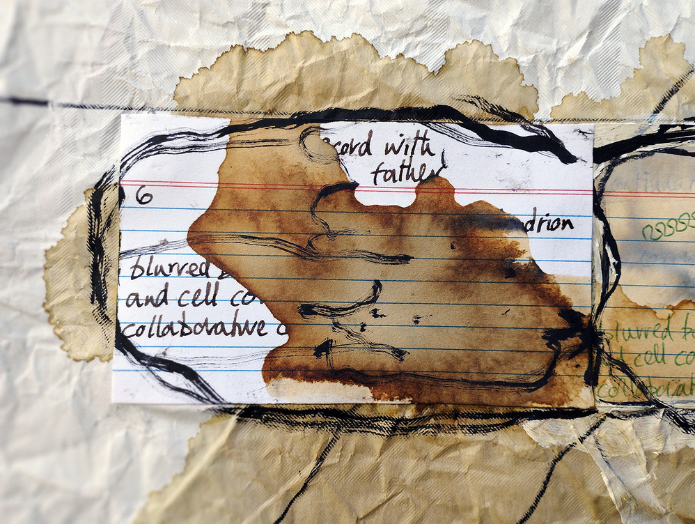 Fig 41: Cellular Community second state of drawing. Coffee staining, ink, acrylic, attached filing cards, on crumpled tablecloth paper, 100 x 120cm © Michael Croft