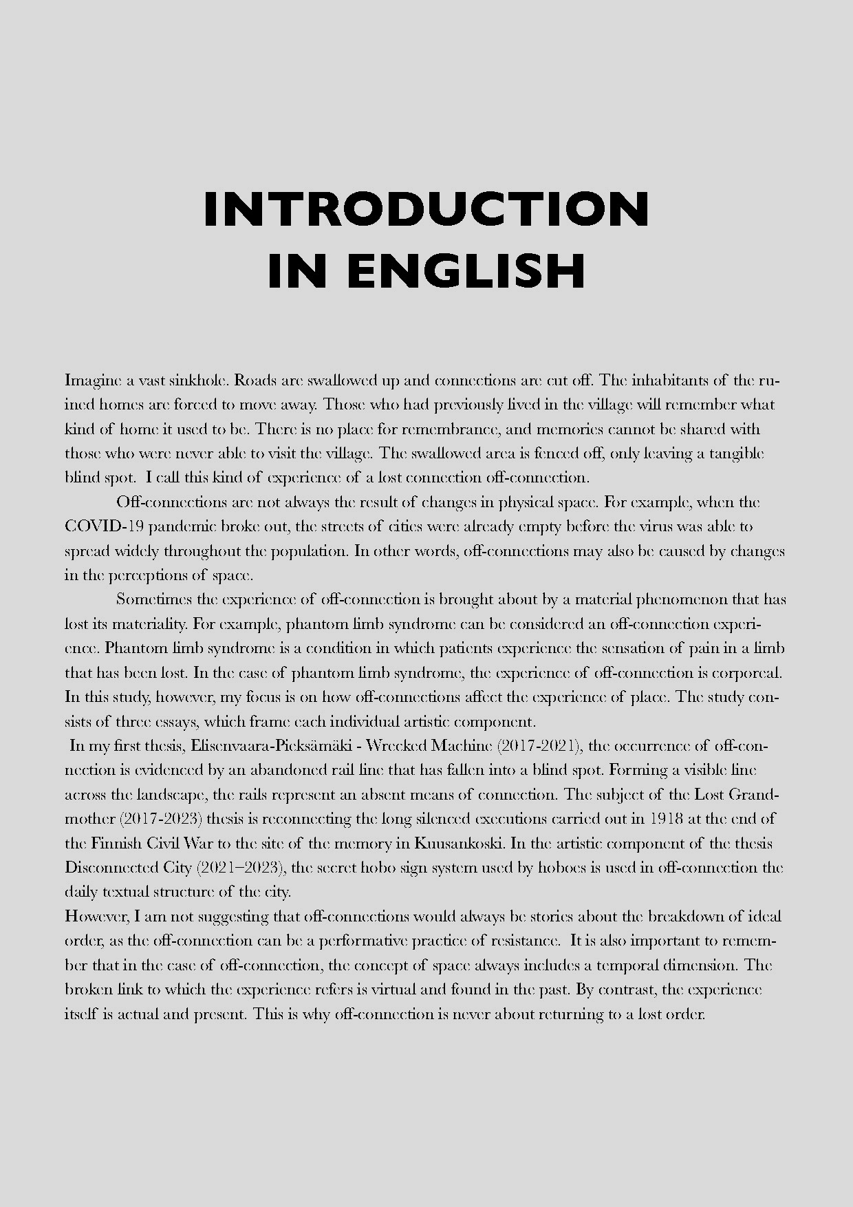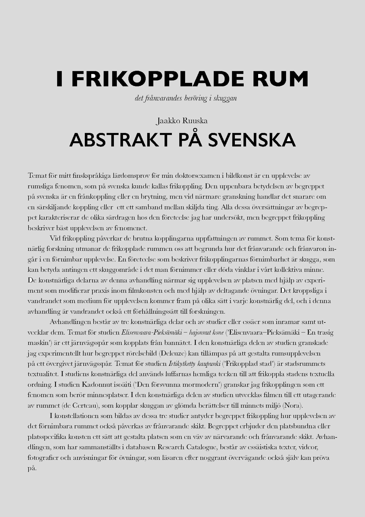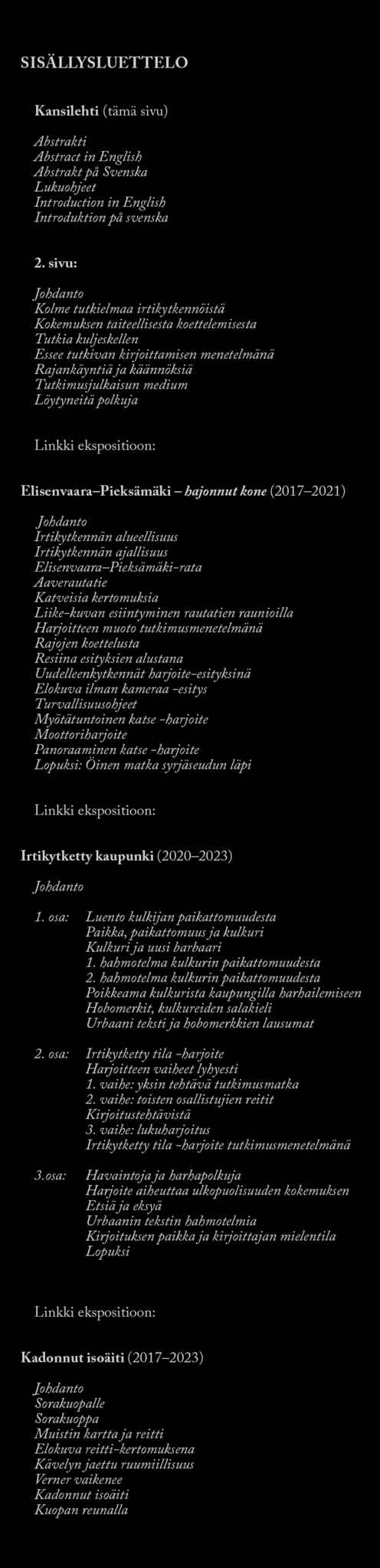 Näissä kolmessa tutkielmassa kehitän irtikytkennän käsitteeksi, joka auttaa tunnistamaan sellaisten paikan kokemuksellisuuteen kuuluvien tasojen vaikutuksen, jotka ovat piileviä eli sellaisia, etteivät ne ole välittömästi aistittavia tai julkilausuttuja. Kehitetty käsite auttaa hahmottamaan taiteen paikkasidonnaisuutta koskevia kysymyksiä, sillä se tarjoaa käsityksen paikasta sekä läsnäolevien että poissaolevien kytkösten kudelmana. Taiteen menetelmille irtikytkentä tarjoaa kehyksen, jonka avulla voidaan höllentää niitä tilakokemuksen tasoja, joista muodostuu arkinen tilan kokemus. Tutkimus koostuu esseistisistä kirjoituksista, videoista, valokuvista ja harjoitteiden ohjeistuksista, joita lukija voi huolellista harkintaa käyttäen kokeilla myös itse.