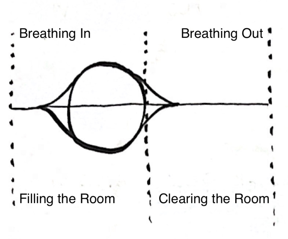 With this statement Byunggil underlined that a phrase or pattern should not be seen as a one directional sequence but almost like a living being that moves in the room. In our lessons we played single notes and whole phrases and directed them forwards, backwards, up and down. The awareness of directions gives the music a more “lively” character and a different form of expression. Blending and combining the movements of forward, backward, up and down creates tension and release that is constantly flowing. These movements and the interplay between tension and release informs the circulation of breathing in my project.