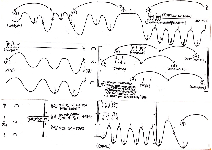 I would also like to thank my external teachers in traditional Korean music and dance: Yunhee Choi (dance), Sol-I So (singing) and Byunggil Choi (percussion). It was very inspiring to study and research elements, philosophy and approaches from the Korean traditions. It helped my research a lot in terms of defining, conceptualizing and realizing. The meetings and lessons with Yunhee and Sol-I took place in Berlin and with Byunggil I met in South Korea.