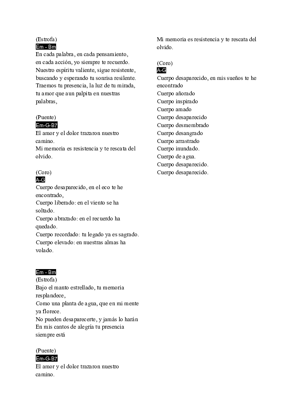 Esta canción-escena investigará la propuesta de audiodescripción creativa en donde se baila una canción pre-grabada sincronizando la danza con la letra y tratará sobre la desaparición forzada en Colombia. Es decir, la letra de esta canción describe de manera metafórica lo que sucede en escena y a la vez habla del tema a tratar: las personas desaparecidas en Colombia debido a la violencia.