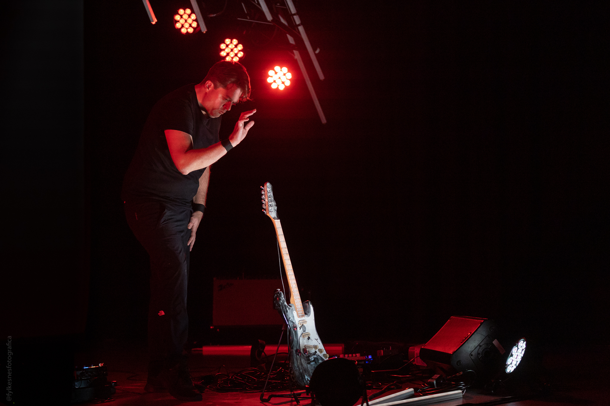 I sit and wait. The first of my fellow musician, a noise musician, is standing idle…waiting for my cue. We start playing. Just making crackling noises, trying to sound like electricity. Is this the best sound? Using my nails to produce the sound I want to, just like I’ve rehearsed. Does it sound a bit different now? It’s the gate in the fuzz pedal, it feels like it triggers a bit to slow, maybe I need more gain? Nah…just stay in the bit. More intensity, faster movements…I wonder if the audience think that it will be like this for the next hour? How long have we stayed in this bit now? I look at my left, Bishop is ready. I give him a short nod, now he can bring in the sub. Is it going to be loud enough? I want the room to shake. There it is. But…I should stand up for the next bit, it’s a bit weird to sit while playing that section…I stand up…wait, this also felt a bit weird. The audience is sitting, why am I standing ok…stay in the bit. Start playing the next section. Damn…not loud enough, more fuzz, more volume. Ok…I know it sounds different through the PA. Trust the sound guy…after all, he’s Bishops brother, and we’ve had 2 days of preproduction. He knows how I want it to sound. I picture the car scene in Lost Highway, and the scene with the slowed down version of «American Woman» in Twin Peaks -The Return. That’s what I wanted. Do I do this too much? Go to Lynch for inspiration? I wonder how many in the audience who have seen my Twin Peaks concerts, I guess this is a bit different. I’m going to sit down again for the next bit. This feels a bit strange. But stay in the bit. Stay. In the bit. That guitar amp sounds great, I love that amp. Wish it was mine. Does it smell burned? Ah no…it’s that bloody smoke machine, 6 months of downtime weren´t good for it. Stay. In. The. Bit. Vidar. I’m calm. Too calm? To calculated?