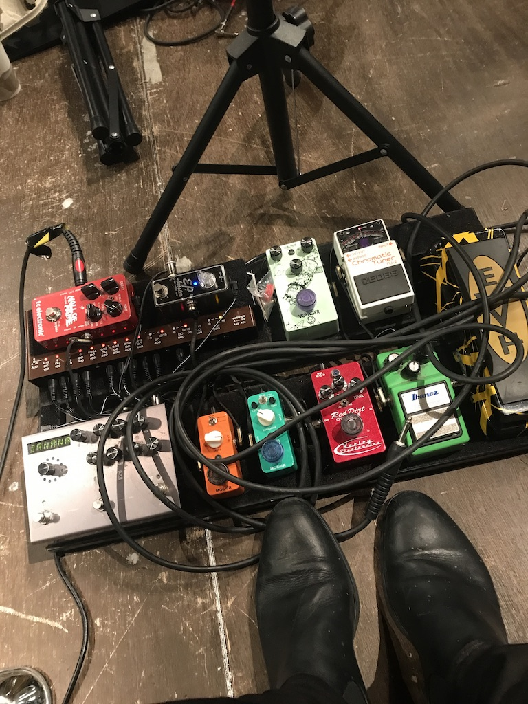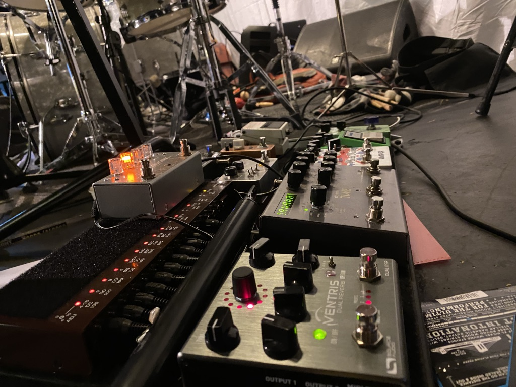 The above picture is of the pedalboard(s) I used in Mechanical Forest 3. The picture is out of focus, but I don’t think it was intentional. That red one (Keeley Red Dirt) on the right broke during the first day of preproduction. I’ve had it on my board for 9 years. It’s my main overdrive-pedal. Luckily, I managed to borrow a similar one for the concert. Overdrive pedals are strange. I find most of them to be completely wrong for my use. When I play a “wrong” one, they sound “cheesy” or “tacky”, it’s hard to explain. There is a sonic history, and a sonic identity in an overdrive pedal. They can make me sound like I have a different musical taste than I have. The Keeley Red Dirt is connected to my musical taste. I tried several other overdrive pedals the day the red one broke. I got really stressed and depressed, they really didn’t work in the solo piece. I posted a little cry for help on Facebook, and the guitar community came to the rescue. The guy (thanks Lage) who had one even came to the venue with the pedal…on a bike. He understood the importance of an overdrive pedal. I’ve been using this pedal with my Goldtop-guitar for so long that I know how they react to each other. This pedal makes the neck of the guitar vibrate in a certain way when I play it, It might sound strange, but I do recognise this vibration. When I strike a F# Power chord using this pedal and the Goldtop, I feel powerful and at home.