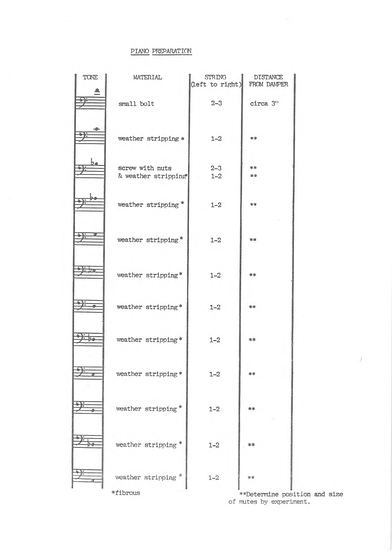 High B-flat pitch is the only one with two preparations at the same time. As Vaes says: "triple-string notes can be used for two different kinds of sounds without changing preparations" (Vaes, 2009, p. 79). To achieve this effect it is necessary to use the una corda pedal (that shifts the hammers to strike only the second and third string). That is, high Bb usually will have two preparations, screw with nuts and wheather-stripping, and, in other occassions (Very Slow - bar 74 and Slower - bar 108), using the una corda pedal, just screw with nuts. The use of this pedal also affects high F pitch: "If only the second and third string of a triple-string chorus is prepared (e.g. by a bolt put in between them), the preparation pitch of those two strings will mix with the unprepared first string of the chorus. When depressing the una corda pedal, only the preparation pitch is activated" (Vaes, 2009, p. 79).