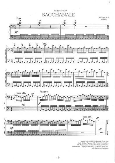 "Originally I knew where the preparations for Bacchanale should be placed and what they were, and so I didn´t write them down. As time passed and I no longer played it, my memory faded, etc. When the piece was prepared for Peter, I tried it out on some piano (I haven´t had on of my own since 1954) and wrote down what I thought was o.k. Then when Jeanne made the recording, we had a different piano, and so made the preparation that seemed suitable for it." (quoted in Vaes, 2009, p. 723).