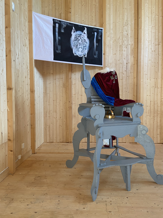 Over the years I've twisted, turned, and experimented with this kingdom, I've also played with symbols of power. Before this course, I got the suggestion early on to build a throne. I started by doing research where I contacted the Royal Castle in order to find out what a possible throne that I could create could look like. It turned out that the Swedish royal throne is the one that was built for Queen Kristina's coronation, the Silver Throne, thus the daughter of Gustav II Adolf, my father's strange choice of hero image on the wall in the library. After I made a sketch, with the help of the artist Johan Wiking, I had my own throne built, in some way the ultimate symbol of power. I feel very uncomfortable. I think it's the last play with my dad's world. Now I'm leaving the country Roma and the apartment on Krukmakargatan