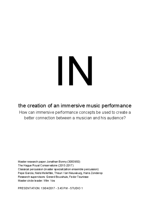 Name: Jonathan Bonny Main Subject: Classical Percussion Research Supervisors: Gerard Bouwhuis, Fedor Teunisse Title of Research: IN – the creation of an immersive music performance Research Question: How can immersive performance concepts be used to create a better connection between a musician and his audience? Summary of Results: In my research, I reflected on several aspects of a concert and how I want to communicate with my audience. Throughout the research I realised that finding ways to immerse an audience is easier said than done. My belief in immersion as a tool to guide listeners towards a certain atmosphere, attitude or interpretation is nevertheless still as strong as before. More than ever, I am convinced that this is the way for me to perform. This is particularly the case for contemporary music where inexperienced listeners might appreciate some guidance. This paper aims to inform (performing) readers of the possible (positive and negative) consequences of creating an immersive performance. Creating an immersive performance is difficult. It takes a lot of time, something musicians often do not have. In addition to learning the music, the performer needs time to brainstorm about the kind of immersion that supports the musical idea and does not distract from it. The line between the two is very thin. Once the immersion concept is established it often takes a lot of preparation to execute it. To bring elaborate ideas to fruition musicians will need the help of technicians, engineers, other artists etc. This explains why immersive performances are often organised by ensembles that rely on a bigger production team and budget. The danger here lies in the fact that those teams are often too far removed from the actual content of the music. Realising this made me think about other ways to connect with an audience. I concluded that besides immersion, also attitude and mindset are very powerful tools to decrease the distance between a performer and the audience. Low-tech solutions like literally performing very close to or surrounded by them are very effective to emotionally connect with the audience. Because of the reflective character of the topic I chose to write my dissertation in the form of an essay. My goal is not to present 'the ultimate truth' but to inspire myself and other musicians to create a personal (contemporary) performing identity. Biography: Jonathan Bonny (°1992, Bruges) studied classical percussion at the School of Arts in Ghent, the Sibelius Academy in Helsinki and the Royal Conservatoire in The Hague. He is actively building towards a music culture that knows no distinction between genres and he is consistently looking for innovative ways to present contemporary arts to a bigger audience. He co-founded Headliner (adventurous music collective), Kunstenfestival PLAN B (contemporary arts festival) and IHEART (band).