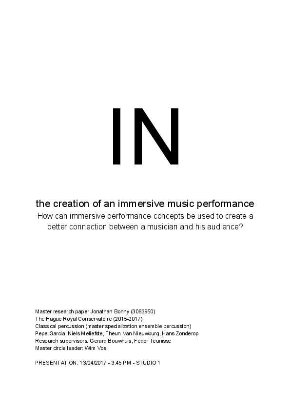 Name: Jonathan Bonny Main Subject: Classical Percussion Research Supervisors: Gerard Bouwhuis, Fedor Teunisse Title of Research: IN – the creation of an immersive music performance Research Question: How can immersive performance concepts be used to create a better connection between a musician and his audience? Summary of Results: In my research, I reflected on several aspects of a concert and how I want to communicate with my audience. Throughout the research I realised that finding ways to immerse an audience is easier said than done. My belief in immersion as a tool to guide listeners towards a certain atmosphere, attitude or interpretation is nevertheless still as strong as before. More than ever, I am convinced that this is the way for me to perform. This is particularly the case for contemporary music where inexperienced listeners might appreciate some guidance. This paper aims to inform (performing) readers of the possible (positive and negative) consequences of creating an immersive performance. Creating an immersive performance is difficult. It takes a lot of time, something musicians often do not have. In addition to learning the music, the performer needs time to brainstorm about the kind of immersion that supports the musical idea and does not distract from it. The line between the two is very thin. Once the immersion concept is established it often takes a lot of preparation to execute it. To bring elaborate ideas to fruition musicians will need the help of technicians, engineers, other artists etc. This explains why immersive performances are often organised by ensembles that rely on a bigger production team and budget. The danger here lies in the fact that those teams are often too far removed from the actual content of the music. Realising this made me think about other ways to connect with an audience. I concluded that besides immersion, also attitude and mindset are very powerful tools to decrease the distance between a performer and the audience. Low-tech solutions like literally performing very close to or surrounded by them are very effective to emotionally connect with the audience. Because of the reflective character of the topic I chose to write my dissertation in the form of an essay. My goal is not to present 'the ultimate truth' but to inspire myself and other musicians to create a personal (contemporary) performing identity. Biography: Jonathan Bonny (°1992, Bruges) studied classical percussion at the School of Arts in Ghent, the Sibelius Academy in Helsinki and the Royal Conservatoire in The Hague. He is actively building towards a music culture that knows no distinction between genres and he is consistently looking for innovative ways to present contemporary arts to a bigger audience. He co-founded Headliner (adventurous music collective), Kunstenfestival PLAN B (contemporary arts festival) and IHEART (band).
