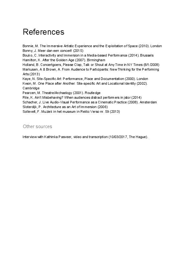 Name: Jonathan Bonny Main Subject: Classical Percussion Research Supervisors: Gerard Bouwhuis, Fedor Teunisse Title of Research: IN – the creation of an immersive music performance Research Question: How can immersive performance concepts be used to create a better connection between a musician and his audience? Summary of Results: In my research, I reflected on several aspects of a concert and how I want to communicate with my audience. Throughout the research I realised that finding ways to immerse an audience is easier said than done. My belief in immersion as a tool to guide listeners towards a certain atmosphere, attitude or interpretation is nevertheless still as strong as before. More than ever, I am convinced that this is the way for me to perform. This is particularly the case for contemporary music where inexperienced listeners might appreciate some guidance. This paper aims to inform (performing) readers of the possible (positive and negative) consequences of creating an immersive performance. Creating an immersive performance is difficult. It takes a lot of time, something musicians often do not have. In addition to learning the music, the performer needs time to brainstorm about the kind of immersion that supports the musical idea and does not distract from it. The line between the two is very thin. Once the immersion concept is established it often takes a lot of preparation to execute it. To bring elaborate ideas to fruition musicians will need the help of technicians, engineers, other artists etc. This explains why immersive performances are often organised by ensembles that rely on a bigger production team and budget. The danger here lies in the fact that those teams are often too far removed from the actual content of the music. Realising this made me think about other ways to connect with an audience. I concluded that besides immersion, also attitude and mindset are very powerful tools to decrease the distance between a performer and the audience. Low-tech solutions like literally performing very close to or surrounded by them are very effective to emotionally connect with the audience. Because of the reflective character of the topic I chose to write my dissertation in the form of an essay. My goal is not to present 'the ultimate truth' but to inspire myself and other musicians to create a personal (contemporary) performing identity. Biography: Jonathan Bonny (°1992, Bruges) studied classical percussion at the School of Arts in Ghent, the Sibelius Academy in Helsinki and the Royal Conservatoire in The Hague. He is actively building towards a music culture that knows no distinction between genres and he is consistently looking for innovative ways to present contemporary arts to a bigger audience. He co-founded Headliner (adventurous music collective), Kunstenfestival PLAN B (contemporary arts festival) and IHEART (band).