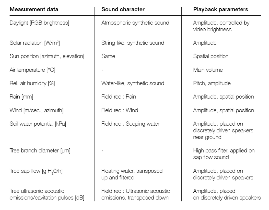 The sounds that we used to sonify the measurement data can be divided into two groups: field recordings (rain, wind, and plant sounds) and synthetic sounds. The majority of these phenomena do not manifest themselves acoustically; thus, generating metaphorical sounds that optimally portrayed a single phenomenon, for instance sunlight or air humidity, was a challenging task. For instance, for sunlight we used a string-like sound, for air humidity, a transformed and filtered burbling sound of a creek. All sound sources have a specific static or dynamic location within the audio system. The sun sound moves across the firmament, from east to west; wind comes from varying directions, louder if strong, softer if weak. As the sun rises, transpiration within the tree starts, and sap flow noises become louder. When the diurnal course reaches its peak at noon, cavitation pulses start, later decreasing during the course of the afternoon.
