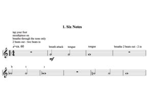Ben van Dijk - Ben’s Basic’s7. This exercise, like the others, begins with producing the tone with the air, no tongue. However this one differs as it adds in different articulations in quick succession over a moving line. On the same note, first a air attack is used, followed by a tongued attack and then repeated over on the same note finishing in a long time, it is then spread over all ranges of the instrument. This is useful for building up the feeling of the air attack immediately followed by the tongue. After a while of doing this I found it easy to do with just the tongue and no air attack preceding it.