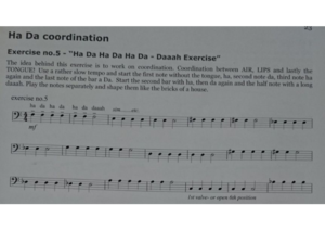Charlie Vernon - A Singing Approach to the Trombone4. This is a fantastic book for bass trombonists. I was recommended by Anton van Houten to try exercise 6. I would play this entire exercise without the use of the tongue. Playing this without the tongue is very difficult. Not using the tongue forces you tomake the sound just using the air. If this is done exactly on the beat your body gets so used to the exhalation that the addition if the tongue is avery easy and natural thing to do. Especially interesting is the use of this exercise in the pedal register. I have never had a problem with a stutter in this register, because to produce the tone in the low octave is extremely difficult with just the air. Therefore I have always used a little bit of articulation without any hesitation. So when playing this exercise with the use of the tongue, I can imagine the way my body feels when playing these lower register notes and apply the same feeling for the higher octave where the stutter is more an issue for me.