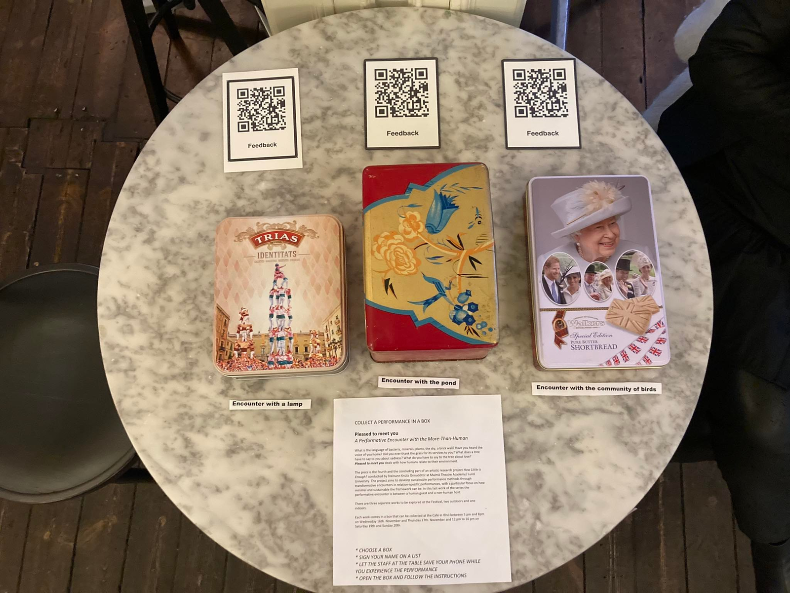 The work provides a format for a performative encounter between human guests and their more-than-human hosts. It is a do-it-yourself performance, that comes in a box with prompt cards and objects. The cards hold the dramaturgical format and contain guidance for tasks; observations, contemplations, and actions, to be performed during the performance.  The objects are to be used to perform some of the tasks. The piece is relation-specific and aspires to facilitate relations between the human and more-than-human agents present during the performance, by awareness, listening and mirroring.