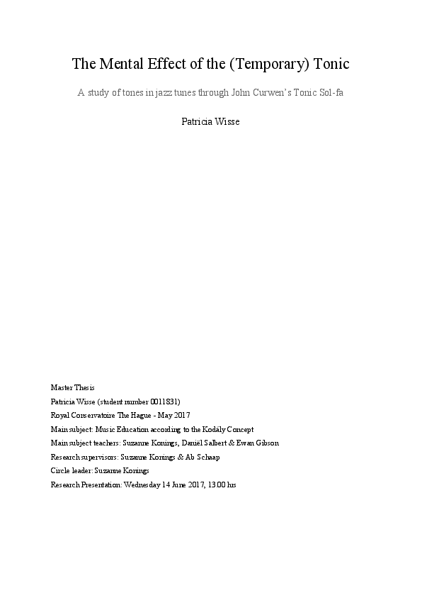 Name: Patricia Wisse Main Subject: Music Education according to the Kodály Concept Research Supervisors: Suzanne Konings & Ab Schaap Title of Research: The Mental Effect of the (Temporary) Tonic: a study of tones in jazz tunes through John Curwen's Tonic Sol-fa Research Supervisor: Suzanne Konings, Ab Schaap Research Question: How can Tonic Sol-fa be used in dealing with (temporary) tonics in short musical forms, such as the 32-bar jazz standard? Summary of Results:: In general, the level of musicianship of (jazz) singers is considered to lag far behind that of their instrumentalist classmates. Are singers somehow not as musical? Or not as interested? Is something different in the approach? Or is the approach not different enough? Looking at what is really needed to be able to improvise in a jazz context, and approaching this through John Curwen¹s Tonic Sol-fa method, this research is an exploration of a vocal and mental alternative to the pianistic approach of vocal improvisation, that is true to our musical experience. Biography: Patricia Wisse studied Theology in Leiden, and then Jazz Voice at Codarts Rotterdam. In 2015 she started her studies at the Royal Conservatoire: Music Education according to the Kodály Concept. Through studying the work of John Curwen, she has developed her own approach in studying and teaching jazz. She has also developed a new music learning tool, the Movable Do Disc, and is continuously developing ideas and methods around it.