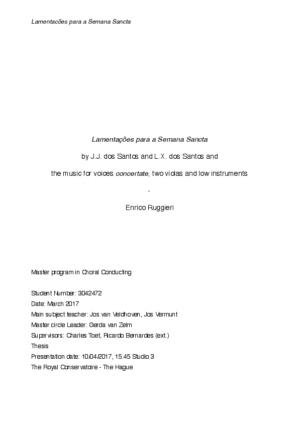 Name: Enrico Ruggieri Main Subject: Choral Conducting Research Supervisors: Charles Toet, Ricardo Bernardes Title of Research: The Lamentações para a Semana Santa by José Joaquim dos Santos and Luciano Xavier dos Santos and the music for two violas, voices concertate and low instruments Research Question: What are the main features of the viola in this specific repertoire and consequently, what becomes its main function? Summary of Results: In 18th-century Portugal, a particular instrumental setting was used in the music composed for a specific Roman Catholic rite called the officium tenebrarum, performed during the Holy Week. This particular instrumentation consists of a standard vocal ensemble, 4 voices concertate, accompanied by a group of string instruments: 2 violas, a cello (or 2 celli) and a double bass. José Joquim dos Santos and Luciano Xavier dos Santos are the composers who exploited this instrumentation best, covering all the needs for music in the Officium tenebrarum. An analysis of two Lamentations by José Joaquim dos Santos and Luciano Xavier dos Santos explores the relation between music and rhetorical tools and how the viola relates to them. Besides being a precious rhetorical tool itself, the analysis discloses that the violas and the low string instruments become a practical replacement for the harmonic instruments. In a liturgy where the organ was officially forbidden there is a need for an instrument or several instruments that could absolve that crucial function. Thanks to his ability in blending with and supporting the voices and, at the same time, respecting the solemnity and the sobriety of the liturgy, the viola became the best organ replacement. Biography: Enrico Ruggieri was born in 1982, graduated in piano, studying with Paolo Russo and Rachele Marchegiani. After a Bachelor in Architecture, there followed a Bachelor degree in Choir Conducting from Pescara Conservatory, a Master degree in Choral Music and Choir Conducting in Bologna Conservatory and a Bachelor degree in Choral Conducting from the Royal Conservatoire, The Hague. He has attended masterclasses with many different musicians specialising in choral conducting and Early Music, such as: Tonu Kalijuste, Peter Phillips, David Lawrence, Julian Wilkins, Walter Marzilli, Marco Berrini, Annibale Cetrangolo, Maurizio Less, and vocal technique with: Ghislaine Morgan, Sandro Naglia, Elisa Turlà (Voicecraft), Federica Fedele (Alexander Technique). He has conducted many amateur choirs with varied repertoire: church music, folk music, early music, mixed choral repertoire. Presently, he is conducting “Lassus Consort” an Early Music vocal ensemble in Amsterdam and the “Quod Libet Kamerkoor” in The Hague.