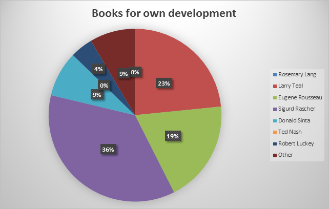 I expected this and the previous question to bring out similar answers, but I wanted to see if everything that the respondents had studied in their own development was passed onto their pupils, or if they simply recommended the most well-known books. As the respondents teach at different levels, I initially expected to find a difference in those books suggested, as potentially those studying at high school might not be able to make progress from an older book such as that by Rascher/Rousseau.
