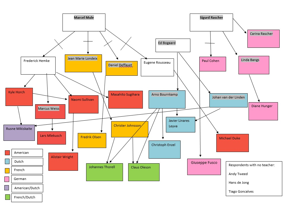 To be able to compare teacher preferences and consider their country of learning it was important to know where each individual studied and with whom as many do not learn in their home country. It was also important to be able to link teachers to their predecessors as this would very likely have an impact on their teaching preferences. With this information, I wanted to create a teaching tree, like a family tree, to help visualize if there were links between respondents’ answers.