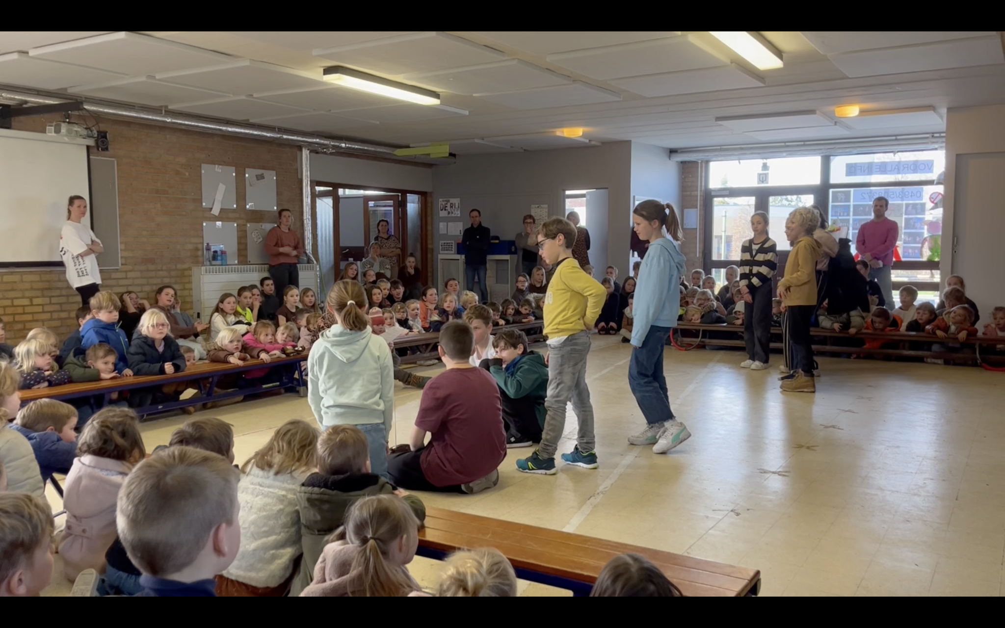 Ook uniek aan mijn aanpak is dat de volledige school, tegen het einde van de dag, ook een gezamelijk nummer kan zingen en dansen. In sommige scholen ging ik van klas naar klas om het nummer 'Zwaar bestaan' aan te leren, in andere scholen leerden mijn collega's de choreografie van het nummer 'Zwaar bestaan' aan hun groepje aan. Dit omdat het gewoon leuk is dat iedereen op school hetzelfde dansje kent, denk aan alle tik tok-hypes. En ook omdat een gezamenlijk nummer een geweldige afsluiter is voor zo een spannende dag.