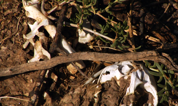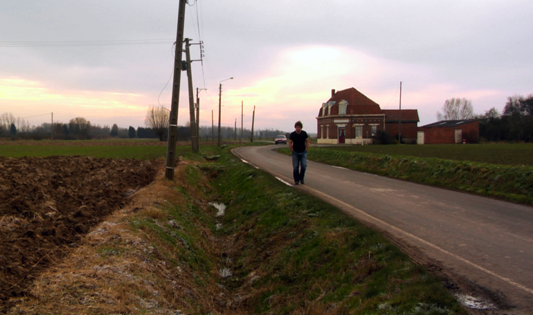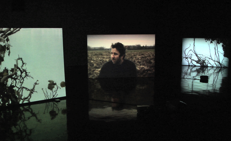 Both environments are empty in different ways and fuse to evoke displacement and absence. In the Mallee we see a goat slaughtered at the roadside, tangles of wire and weeds, rabbit corpses and faeces in plague proportions. In Fromelles the wind blows across fields of frozen mud under grey skies while the protagonist engages in a Beckettesque journey amongst the screens, asking in poor French and German, 'Où est l'avant?' and 'Wohin ist der front?' The character does not attempt to represent or speak for the men of the AIF. Rather, he embodies the search for that historical moment and expresses the impossibility of finding it. An outsider, he is in a state of existential confusion reminiscent of Camus’s L’Étranger or Kierkegaard's ‘Young Man’ from Repetition. These images, in their dirt road wandering, draw upon the Agnès Varda's film Sans toit ni loi, the war time recollections of artists like Robert Graves ((1957) 2000), and the poetry of Siegfried Sassoon to construct an image of fragments, of fleeting encounters characterised by misunderstanding and confusion.
