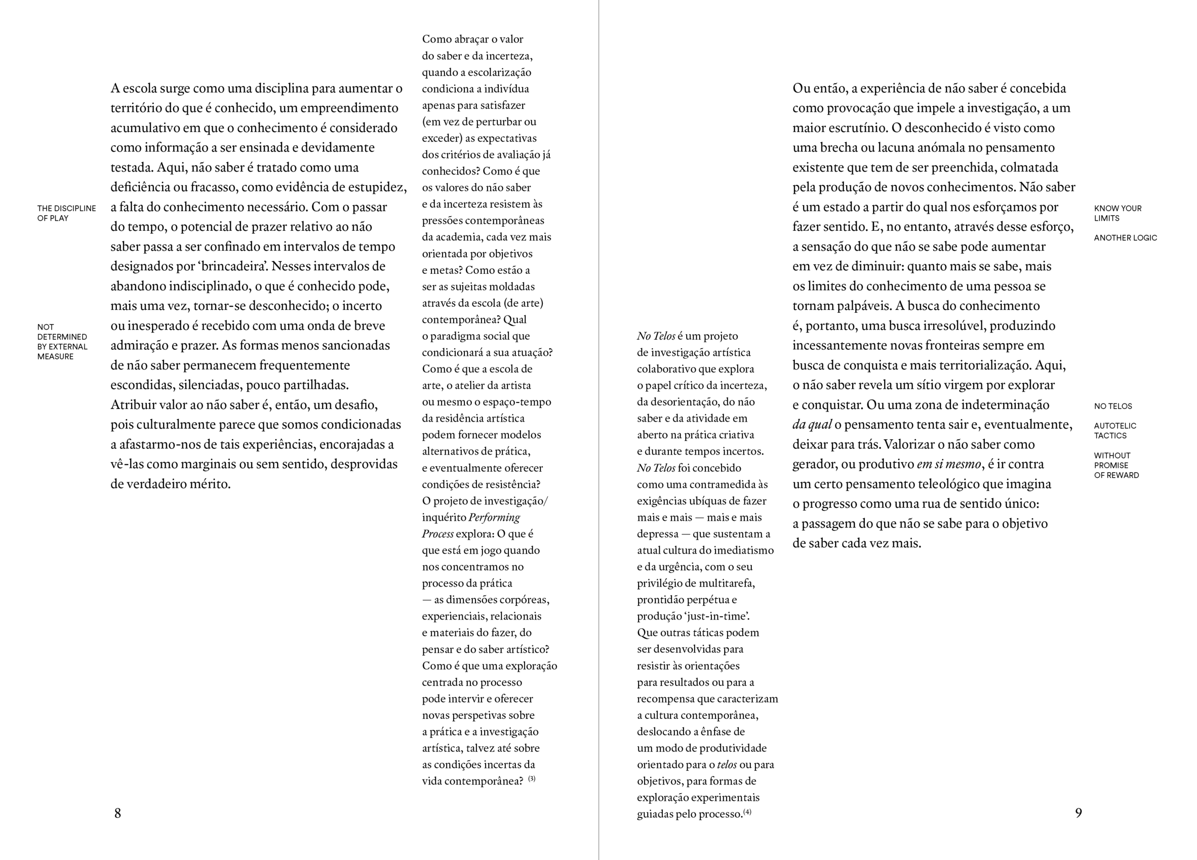 This research exposition is conceived in conjunction with the publication, Artistic Research Does #7 (2023), which presents a translation of Emma Cocker’s essay ‘Tactics for Not Knowing: Preparing for the Unexpected’, originally published in Elizabeth Fisher and Rebecca Fortnum, (eds.) On Not Knowing: How Artists Think, (Black Dog Publishing, 2013). See https://i2ads.up.pt/publicacoes/artistic-research-does-7/ In addition to the translation and re-publication of the original text, the revised version of ‘Tactics for Not Knowing’ in Artistic Research Does #7 offers two further interventions in the form of annotations. In one column of margin notes, Cocker shares additional reflections, referring to some of her more recent artistic research projects and collaborations that continue to resonate with the concerns of the original text. In parallel, a second column of margin notes comprises the titles of additional pieces of contiguous writing drawn from two collections of Cocker’s writing, The Yes of the No (2016) and How Do You Do? (2023). Within this online version these margin notes include hyperlinks that enable the reader to access these different thought-fragments of writing. Artistic Research Does is edited by Catarina Almeida, André Alves. Artistic Research Does is published by i2ADS – Institute of Research in Art, Design and Society is a R&D unit based at the Faculty of Fine Arts of the University of Porto (FBAUP), financed by the Portuguese agency Fundação para a Ciência e a Tecnologia (FCT).