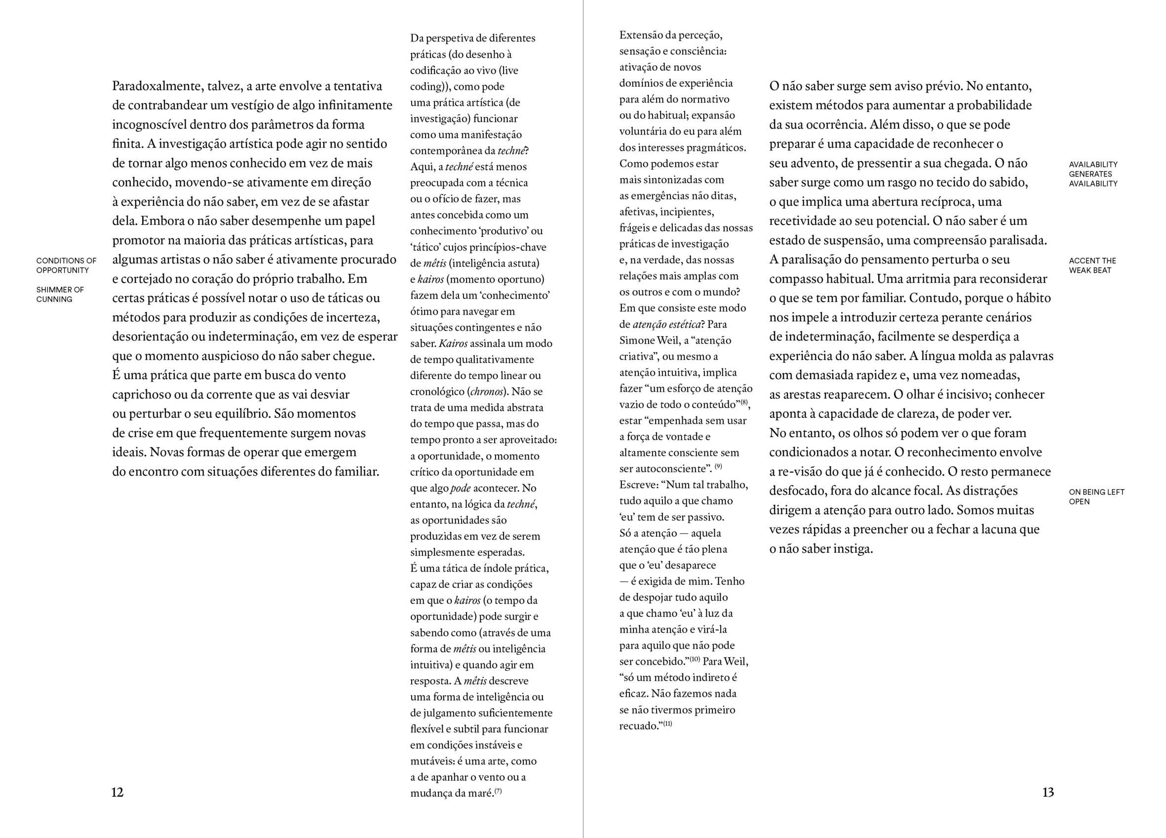 This research exposition is conceived in conjunction with the publication, Artistic Research Does #7 (2023), which presents a translation of Emma Cocker’s essay ‘Tactics for Not Knowing: Preparing for the Unexpected’, originally published in Elizabeth Fisher and Rebecca Fortnum, (eds.) On Not Knowing: How Artists Think, (Black Dog Publishing, 2013). See https://i2ads.up.pt/publicacoes/artistic-research-does-7/ In addition to the translation and re-publication of the original text, the revised version of ‘Tactics for Not Knowing’ in Artistic Research Does #7 offers two further interventions in the form of annotations. In one column of margin notes, Cocker shares additional reflections, referring to some of her more recent artistic research projects and collaborations that continue to resonate with the concerns of the original text. In parallel, a second column of margin notes comprises the titles of additional pieces of contiguous writing drawn from two collections of Cocker’s writing, The Yes of the No (2016) and How Do You Do? (2023). Within this online version these margin notes include hyperlinks that enable the reader to access these different thought-fragments of writing. Artistic Research Does is edited by Catarina Almeida, André Alves. Artistic Research Does is published by i2ADS – Institute of Research in Art, Design and Society is a R&D unit based at the Faculty of Fine Arts of the University of Porto (FBAUP), financed by the Portuguese agency Fundação para a Ciência e a Tecnologia (FCT).