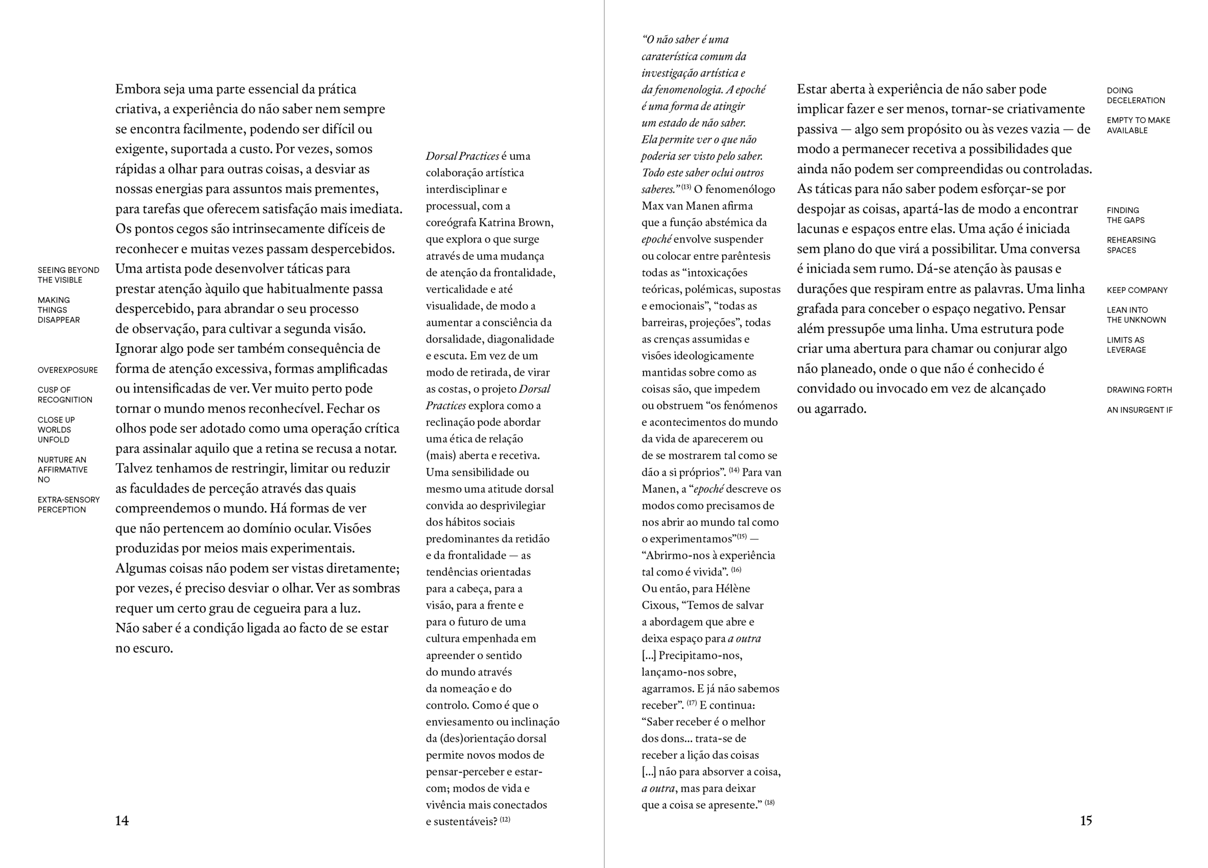 This research exposition is conceived in conjunction with the publication, Artistic Research Does #7 (2023), which presents a translation of Emma Cocker’s essay ‘Tactics for Not Knowing: Preparing for the Unexpected’, originally published in Elizabeth Fisher and Rebecca Fortnum, (eds.) On Not Knowing: How Artists Think, (Black Dog Publishing, 2013). See https://i2ads.up.pt/publicacoes/artistic-research-does-7/ In addition to the translation and re-publication of the original text, the revised version of ‘Tactics for Not Knowing’ in Artistic Research Does #7 offers two further interventions in the form of annotations. In one column of margin notes, Cocker shares additional reflections, referring to some of her more recent artistic research projects and collaborations that continue to resonate with the concerns of the original text. In parallel, a second column of margin notes comprises the titles of additional pieces of contiguous writing drawn from two collections of Cocker’s writing, The Yes of the No (2016) and How Do You Do? (2023). Within this online version these margin notes include hyperlinks that enable the reader to access these different thought-fragments of writing. Artistic Research Does is edited by Catarina Almeida, André Alves. Artistic Research Does is published by i2ADS – Institute of Research in Art, Design and Society is a R&D unit based at the Faculty of Fine Arts of the University of Porto (FBAUP), financed by the Portuguese agency Fundação para a Ciência e a Tecnologia (FCT).