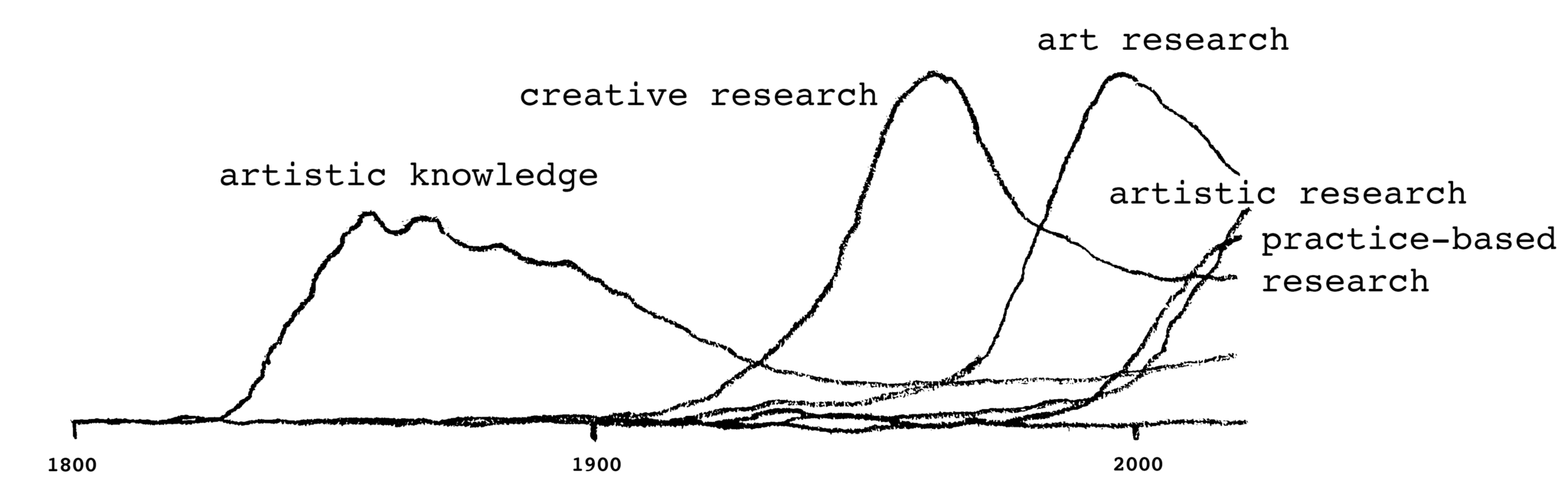 To illustrate this history, I invite you to enter ‘artistic knowledge’, ‘creative research’, ‘practice-based research’, ‘art research’ and ‘artistic research’ into Google’s Ngram Viewer (https://books.google.com/ngrams/info) while playing with the settings in such a way as to not smooth out too much (smoothing >10 will reduce some of the more recent trends). The resulting graph, scientifically very limited in its meaning, may look like this: