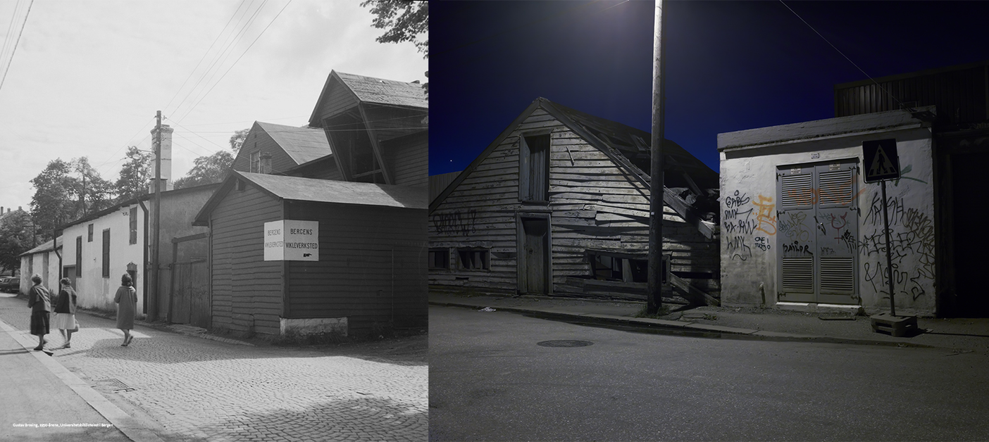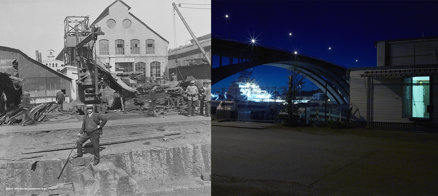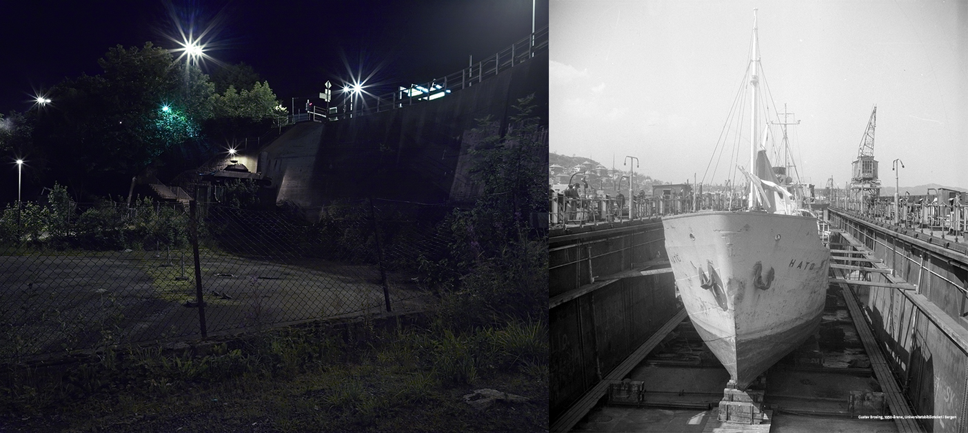 "Damsgaardsveien" is a compressed area limited to approximately 2 kilometres along the harbour and industrial side of Bergen. From the 1920s to 1970s this part of Bergen consisted mainly of shipbuilding yards and other maritime and industrial related activities. Most of these activities today are closed and the neighbourhood is now in a state of post-industrial re-urbanisation. The Bergen council has already initiated plans to reclaim this territory for urban resettlement. Like many of the water-front areas in larger towns in Europe, Damsgaardsveien will eventually constist of flats and centers for modern urban activites, such as shopping malls, cafes and restaurants. Although the Bergen council sees this district as a possibility for modernisation of Bergen, right now, in its semi-ruined state and on the verge of a more or less total make-over, it has a charm and identity that stems from layers of history folded into it’s streets.