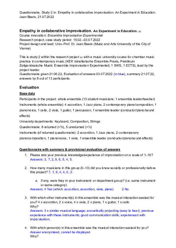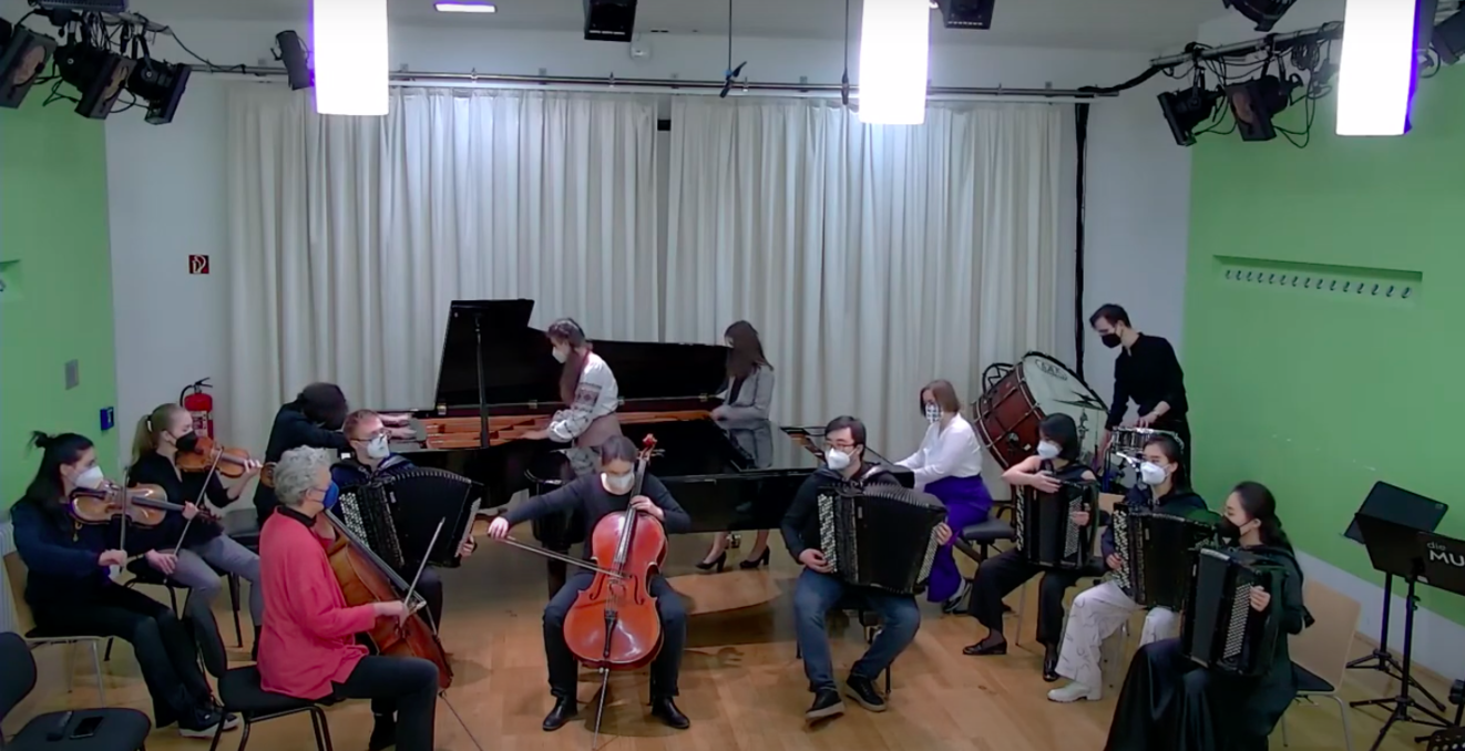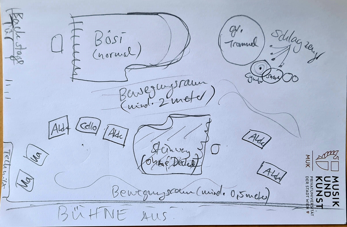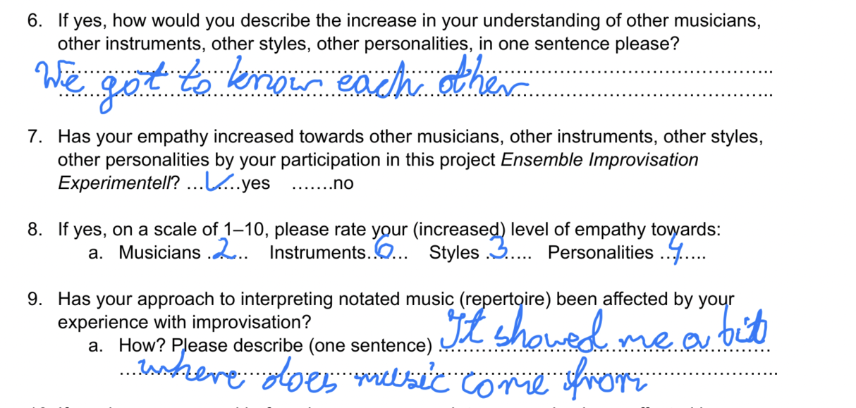 The core goal of my artistic research, or research through and with art, with the ensemble I founded, Ensemble Improvisation Experimentell (E i E) as part of my teaching of contemporary music performance playing at the Music and Arts University of the City of Vienna (MUK) since the summer of 2021, was and is, the encouraging of artistic excellence in both the creative process and the final product or performance, while ensuring a socially sustainable interaction that allows for intersocial and prosocial, of empathic, behavior to arise amongst the group. Artistic excellence can be ensured on a technical and cognitive level with musicians joining the E i E being specifically chosen and self-chosen individuals with a high level of technical skill set and professionalism, well advanced in their tertiary education biography. Divergent in this group, however, were parameters such as cultural backgrounds and language capabilities, and especially interestingly musical and stylistic backgrounds and expertises that varied from contemporary music and extended playing techniques through Romanticism to Jazz. Instruments ranged from piano, accordion, viola, cello, to clarinet, saxophone and voice (and performance), while some performers came to discover new forms of expression by means of moving outside of their instrumental constraints into performative/theatrical expressions.