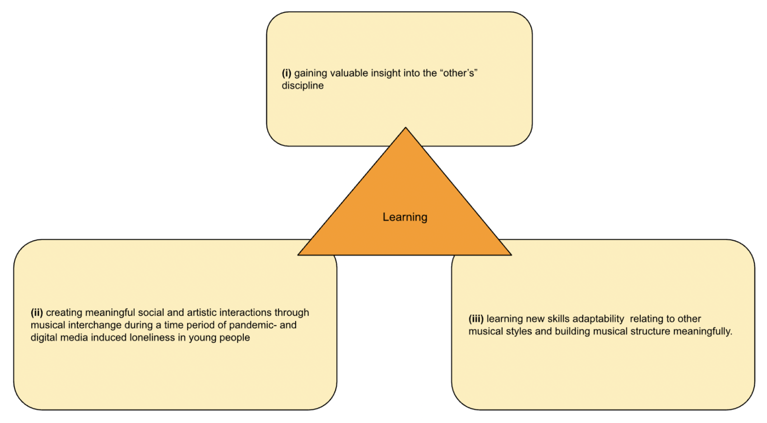 Both the question and hypothesis from my previous artistic study, done with my duo partner in 2019, served as a basis for the current hypothesis. ‘Does collaborative improvisation enhance the level of empathy between artistic performers of different disciplines? If artists of different disciplines collaborate through improvisation, their joint creative work is likely to increase the empathy between them, leading to a more successful artwork.’ (Beers, 2019). This hypothesis, taken from a study exploring collaborative improvisation between myself as a soloist pianist-composer and the soloist dancer-choreographer Ingo Reulecke served as a basis for developing the questions and hypothesis (Fig. 1) of this study with student musicians from divergent cultural and artistically stylistic backgrounds at in Vienna (MUK).