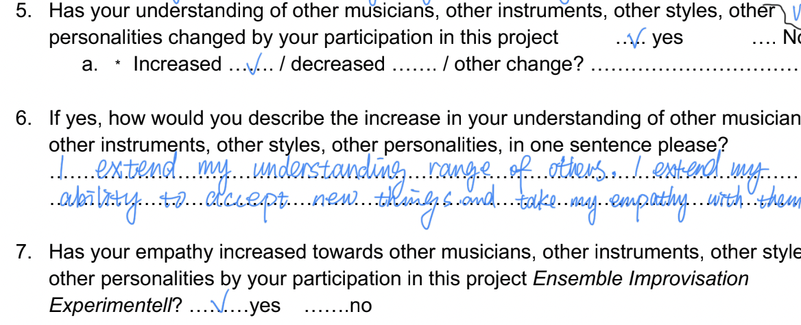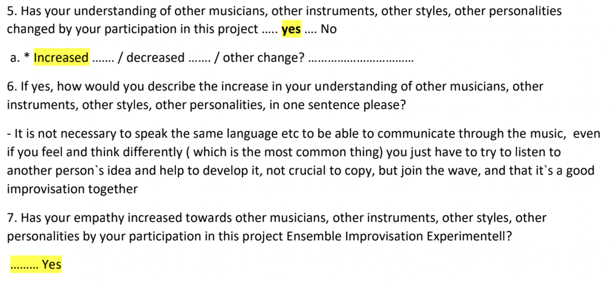Initial impressions gained since the start of my research through my own artistic practice of leading the E i E will aim to contextualize here in this RC exposition how the chosen parameters of collaboration and improvisation affect emotive states in musicians that may be linked to flow state in performance. Results of ‘professional empathy’ or ‘moments of shared empathy’ during the collaborative artistic experience can allow for intersocial behavior promoting prosociality that is sustainable in the long-term. Later on, this exposition will give an overview of subjective experience based data gained from second person perspective observation and introspection using a post-hoc questionnaire, as well as group discussions for re-lived experience explication and using audio- and video documentation as a means of process analysis.