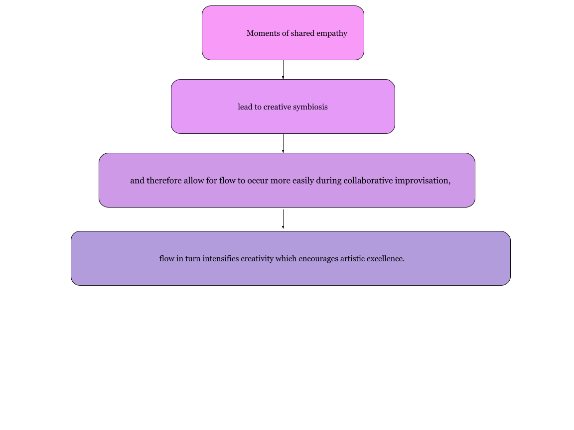 If flow state was reachable systematically controlled by following a clear structure in creative collaboration that prioritizes the individual’s artistic personality and excellence in symbiosis with the group’s shared experience and, more specifically shared emotive state of empathy, practical tasks, trained collaboratively, could lead to the goal in question. Linking moments of ‘shared empathy’ in members of an ensemble for free improvisation to successful creative symbiosis and subsequently systematically creating situations in which flow may arise from such shared moments, can be linked to a rise in grit for the communal musical goal and thus, artistic excellence.