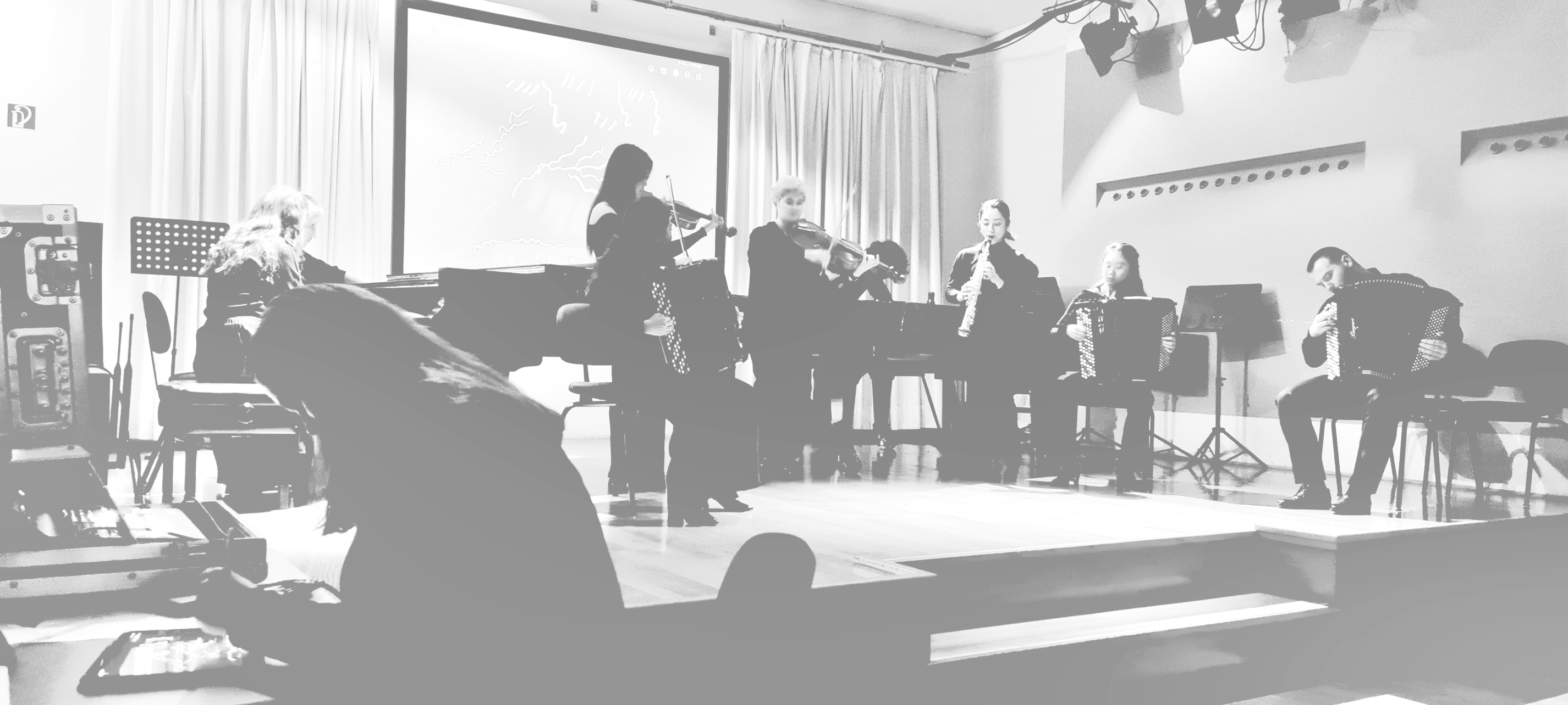 Image 1b (left, semi-transparent, b/w): Same concert still, including live score artist (also a musicians and member of the Ensemble Improvisation Experimentell), drawing the live score while musicians on stage react to the score in real time.