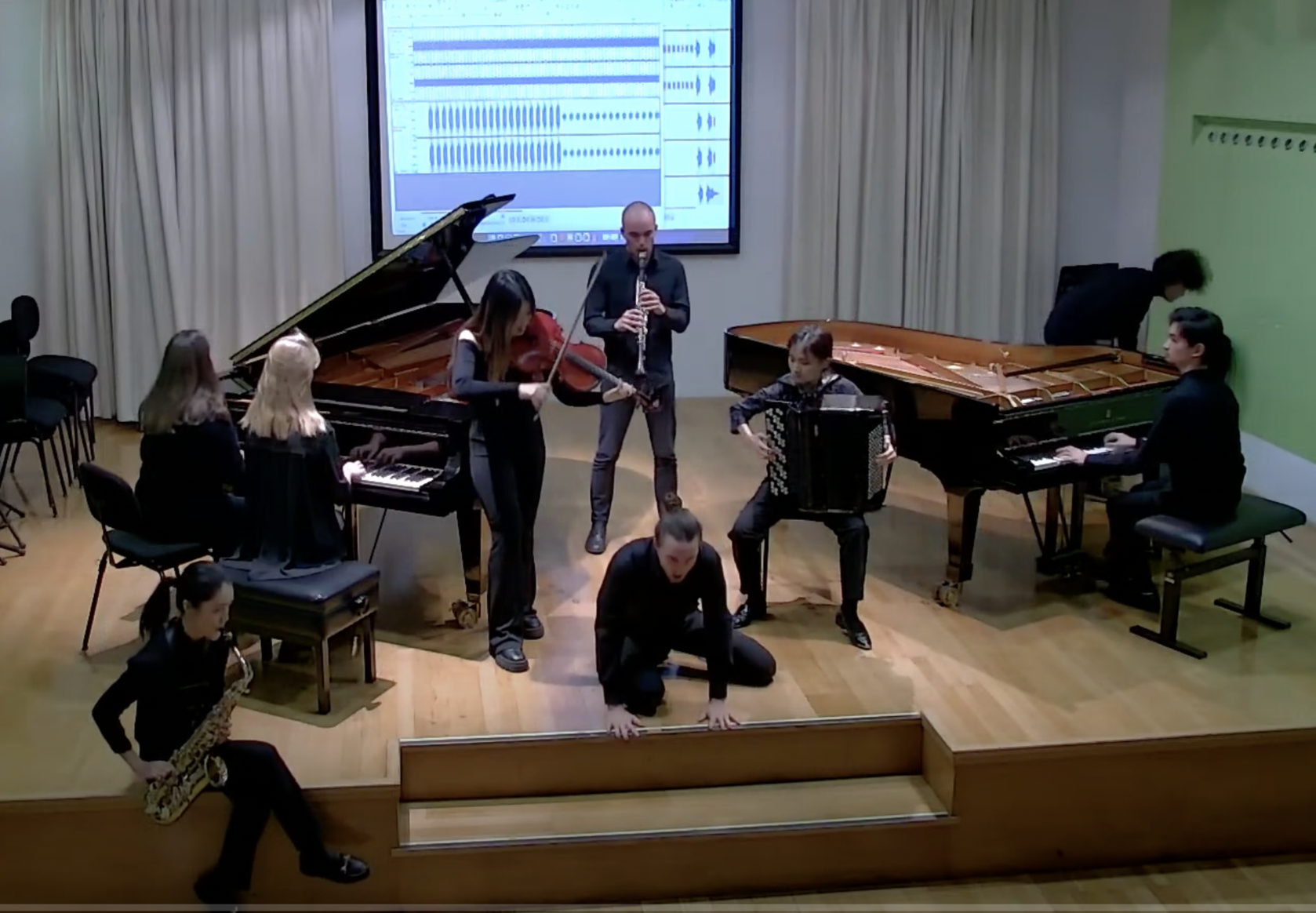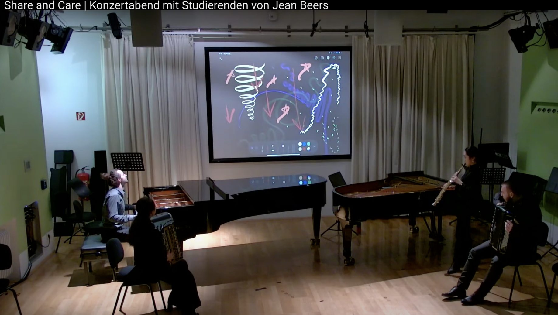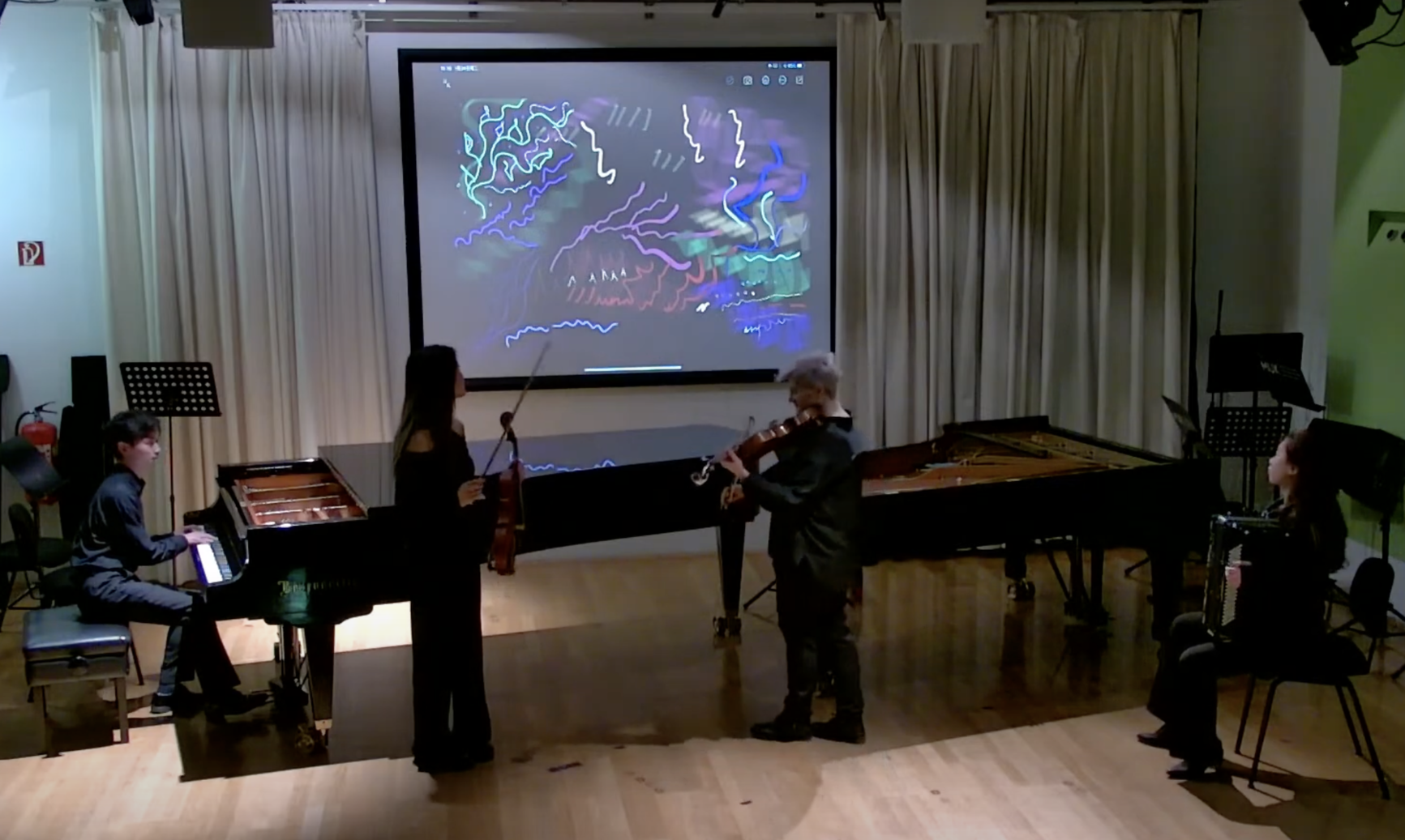 Image 1a (right): This picture shows a moment (screenshot from video 1) of a concert by the Ensemble Improvisation Experimentell. The graphic score, shown, expresses the listening experience by one of the members of the ensemble (shown on image 1b, far left), was created on a tablet connected to the projector screen, mirroring the listening experience of this currently "inactive" (or non-performing) musician of the performance going on at that moment.