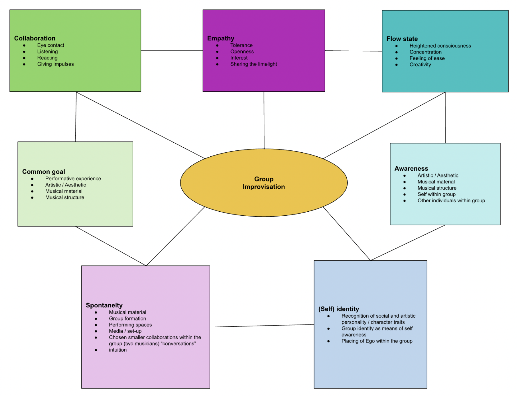 The research background, rationale and analysis relies on artistic qualification and subjective introspection methods to help understand the lived experience-based data. The nature of this research is so multi faceted that it cannot be honed onto one particular aspect, as the parameters and aspects explored during this study, improvisation, collaboration, empathy and flow, are mere stepping stones on the path to developing a framework for future explorations as part of an interdisciplinary fundamental research project. It may seem natural for persons outside of the music business to assume that empathy and other positive and somewhat idealistic emotional states should necessarily play a central role in the arts. But business models of today’s globalized and digitalised societies do not hesitate to drag the arts out of their utopian ivory tower of aesthetic vision. Music students need to prepare for a world of versatility and flexibility to adapt to a changing social framework, by learning skills pertaining to sociocentric rather than egocentric empathy and creative symbiosis as part of a group.
